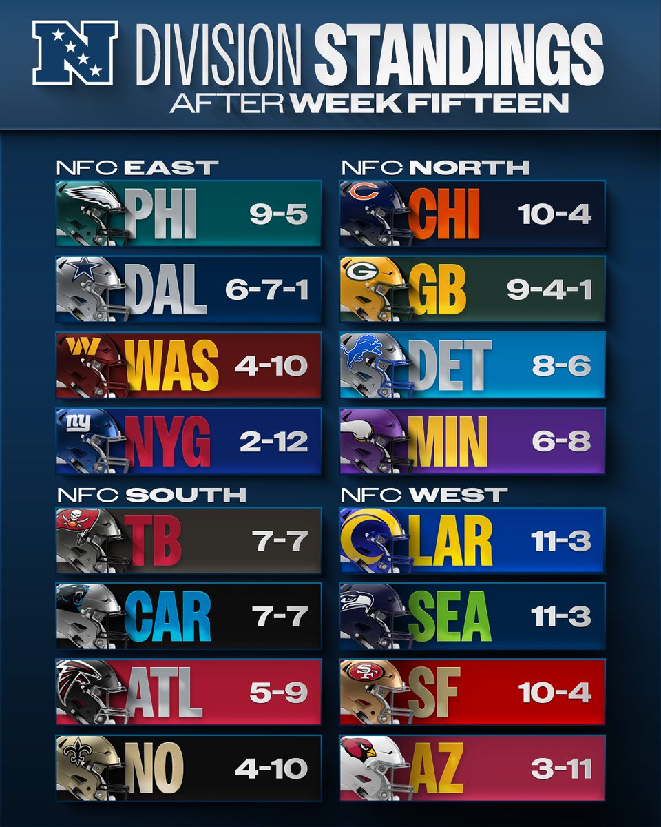 国联东区:费城老鹰,9胜5负;北区:芝加哥熊,10胜4负;南区:坦帕湾海盗,7胜7负;西区:洛杉矶公羊,11胜3负。