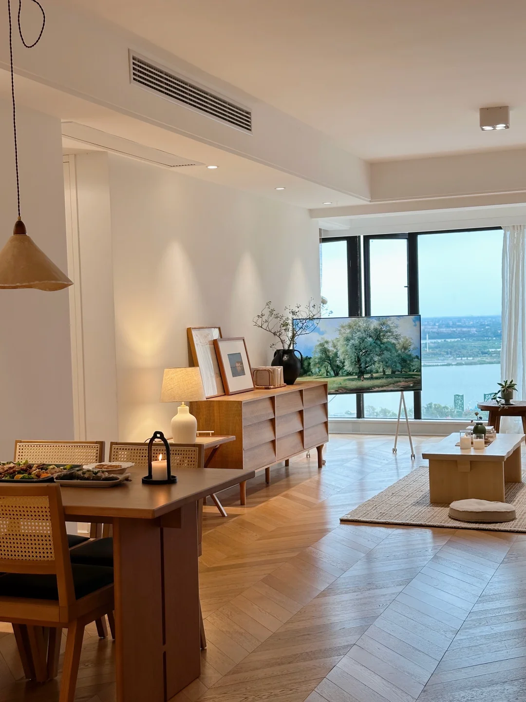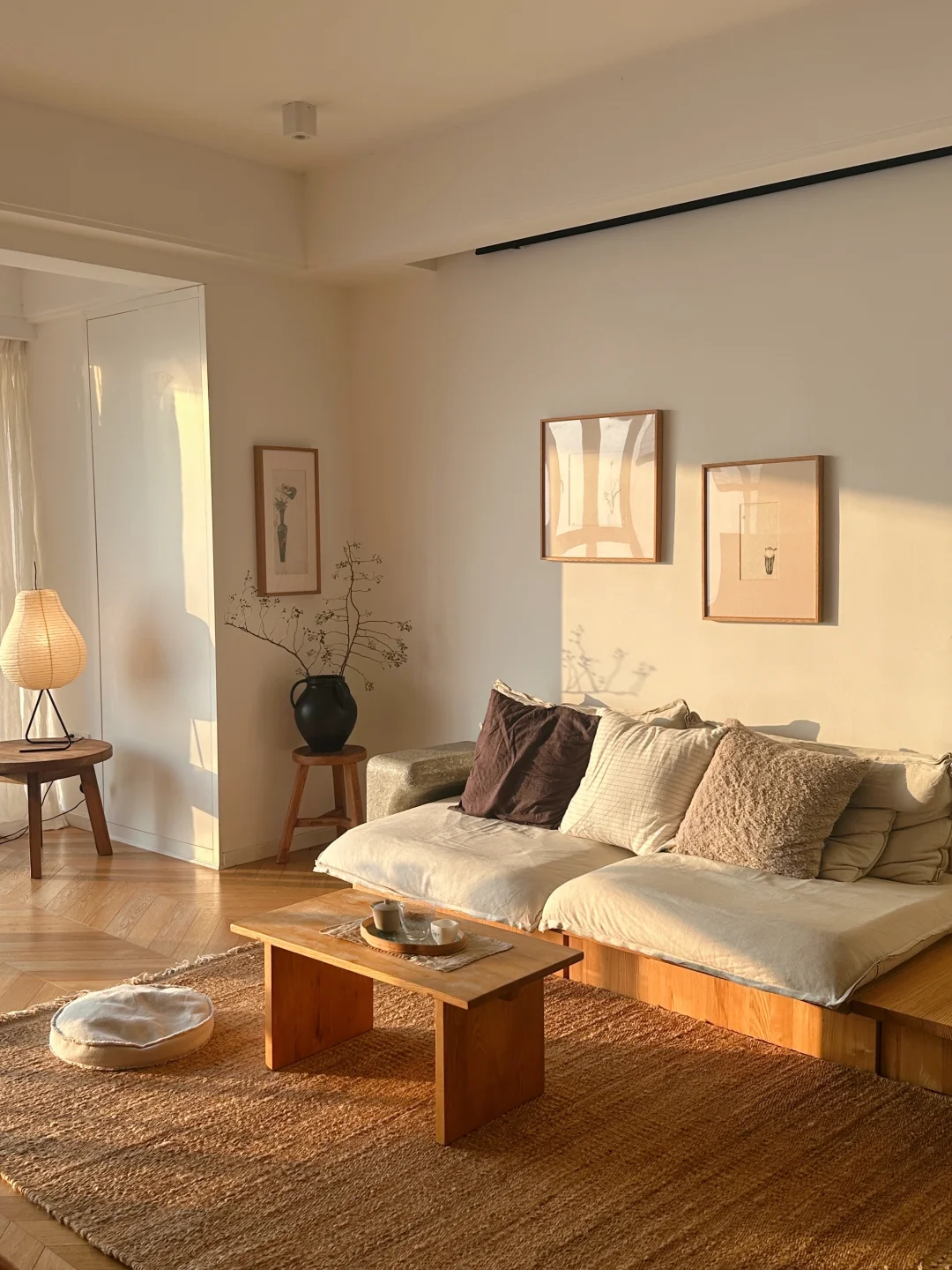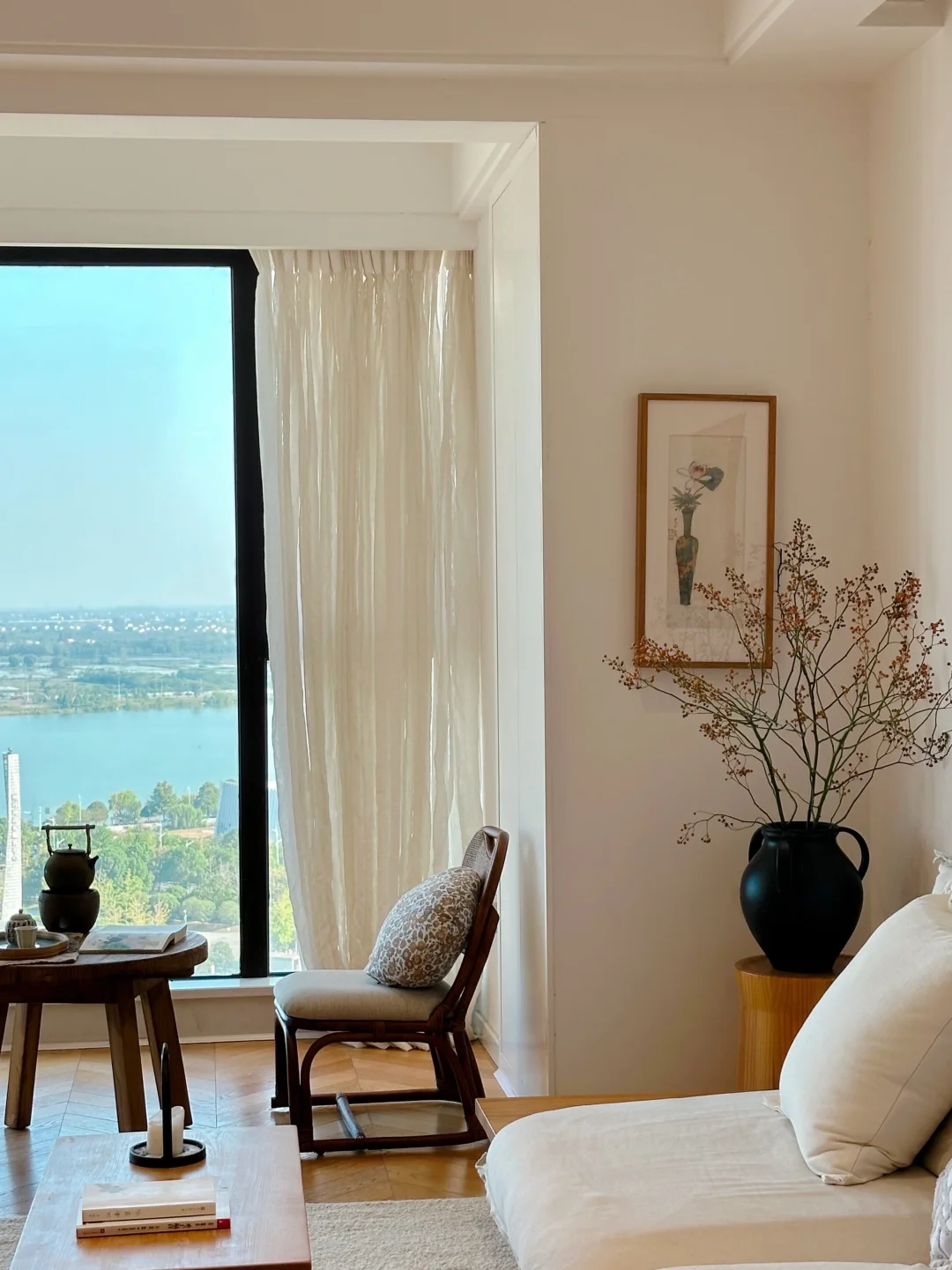 一下子把整个空间衬得明亮又温柔,和原木家具配在一起格外协调。
