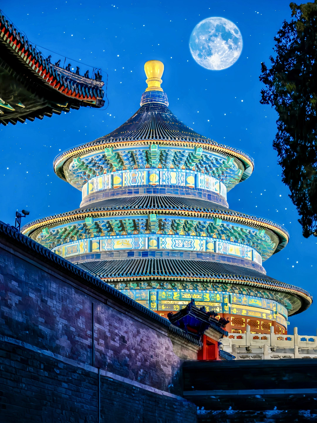 1️⃣北门进来,祈年殿的东北角,和西北角,利用围墙,月亮和树枝构图