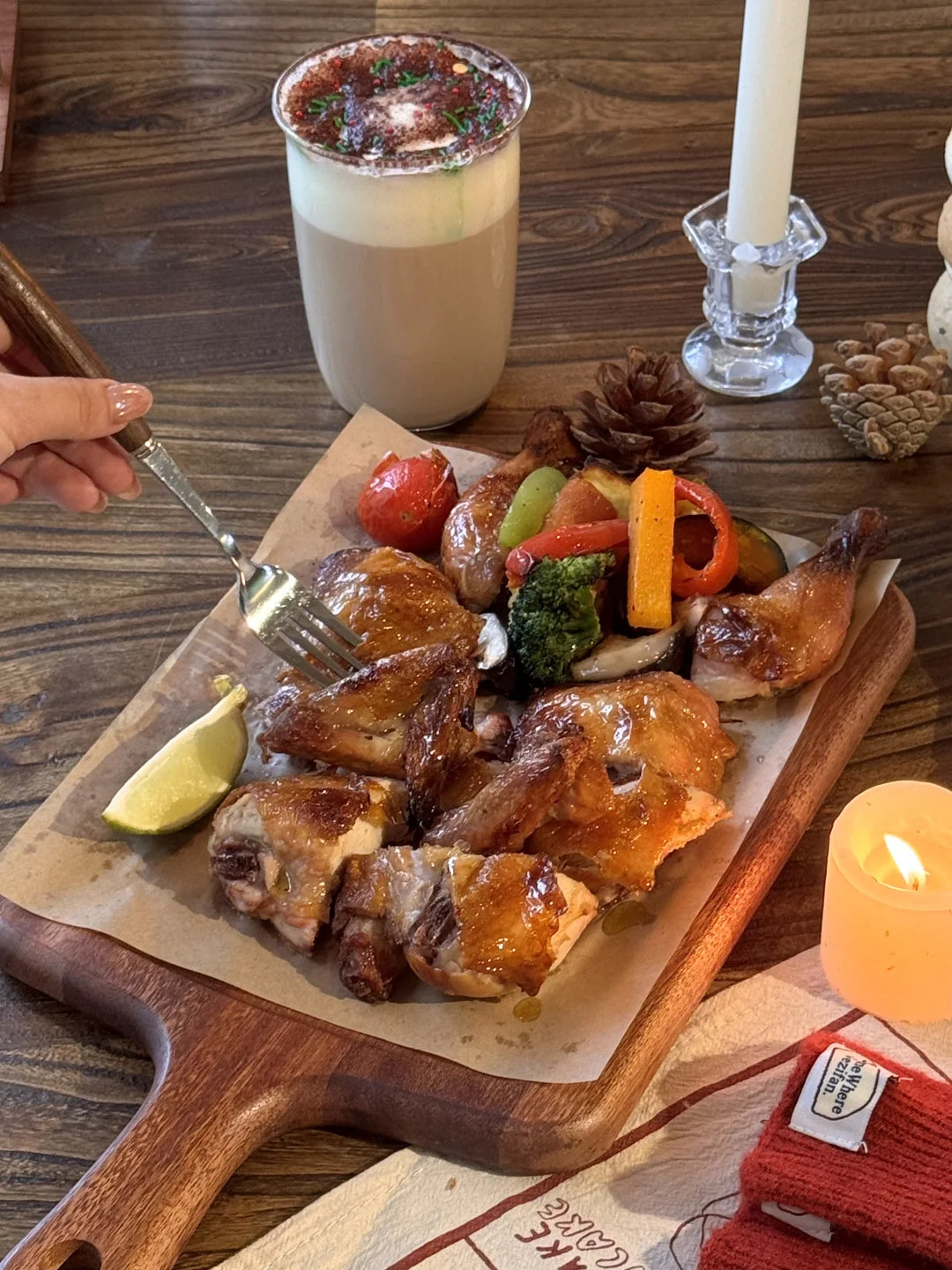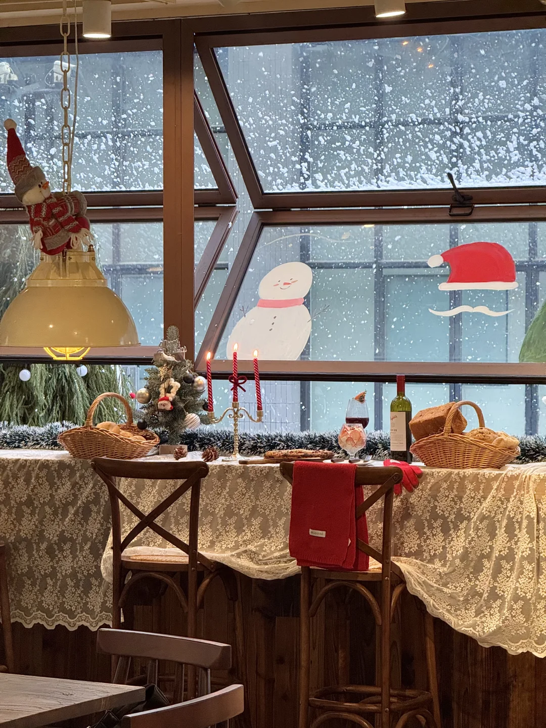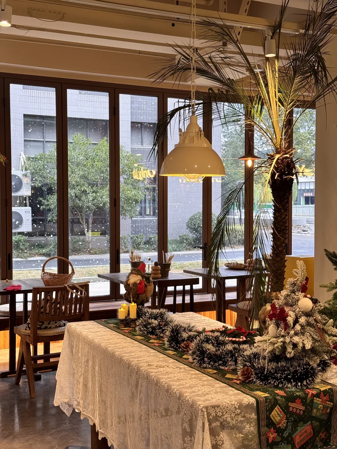 就在转塘街道的社区里!木质sense好温暖,临窗的位置就像画一样📷随手拍拍都很出片!不管是菜品还是环境我都愿意给满分!! 圣诞季和朋友点上一份香草烤鸡和牛排☺️氛围感瞬间拉满!!肉烤炙得嫩嫩的,空口吃或者吃蘸点料碟都好满足!热红酒、榴莲窖烤披萨…每一道都好看又好吃!