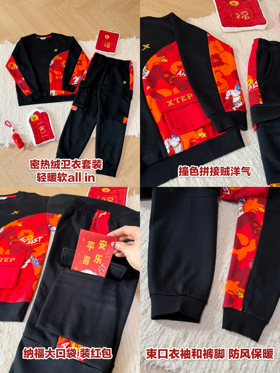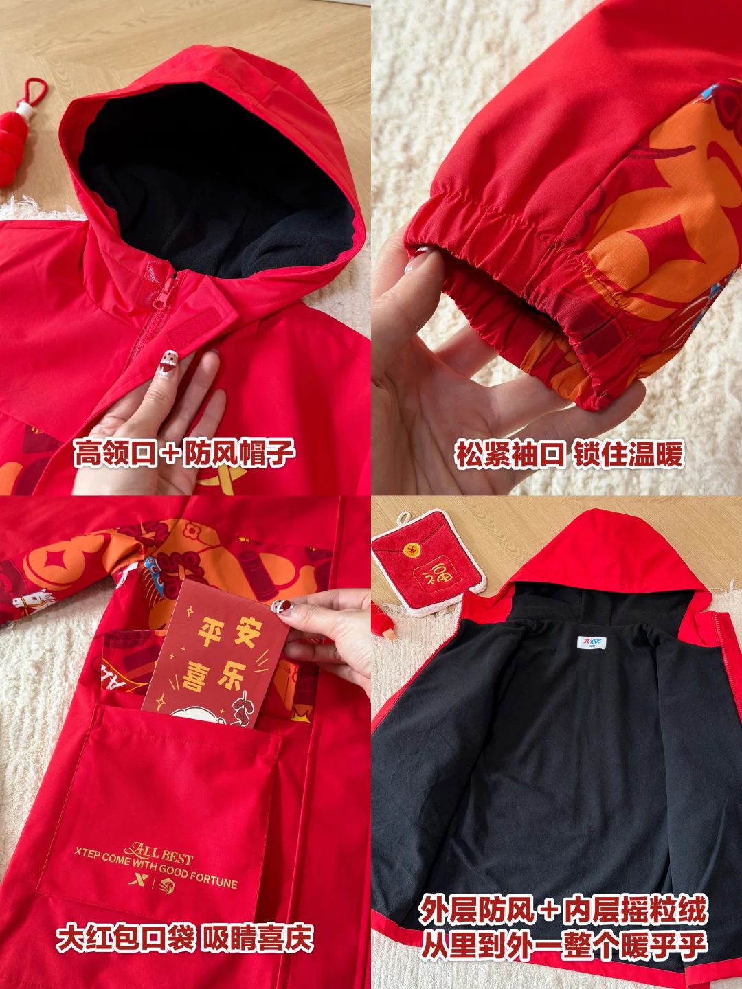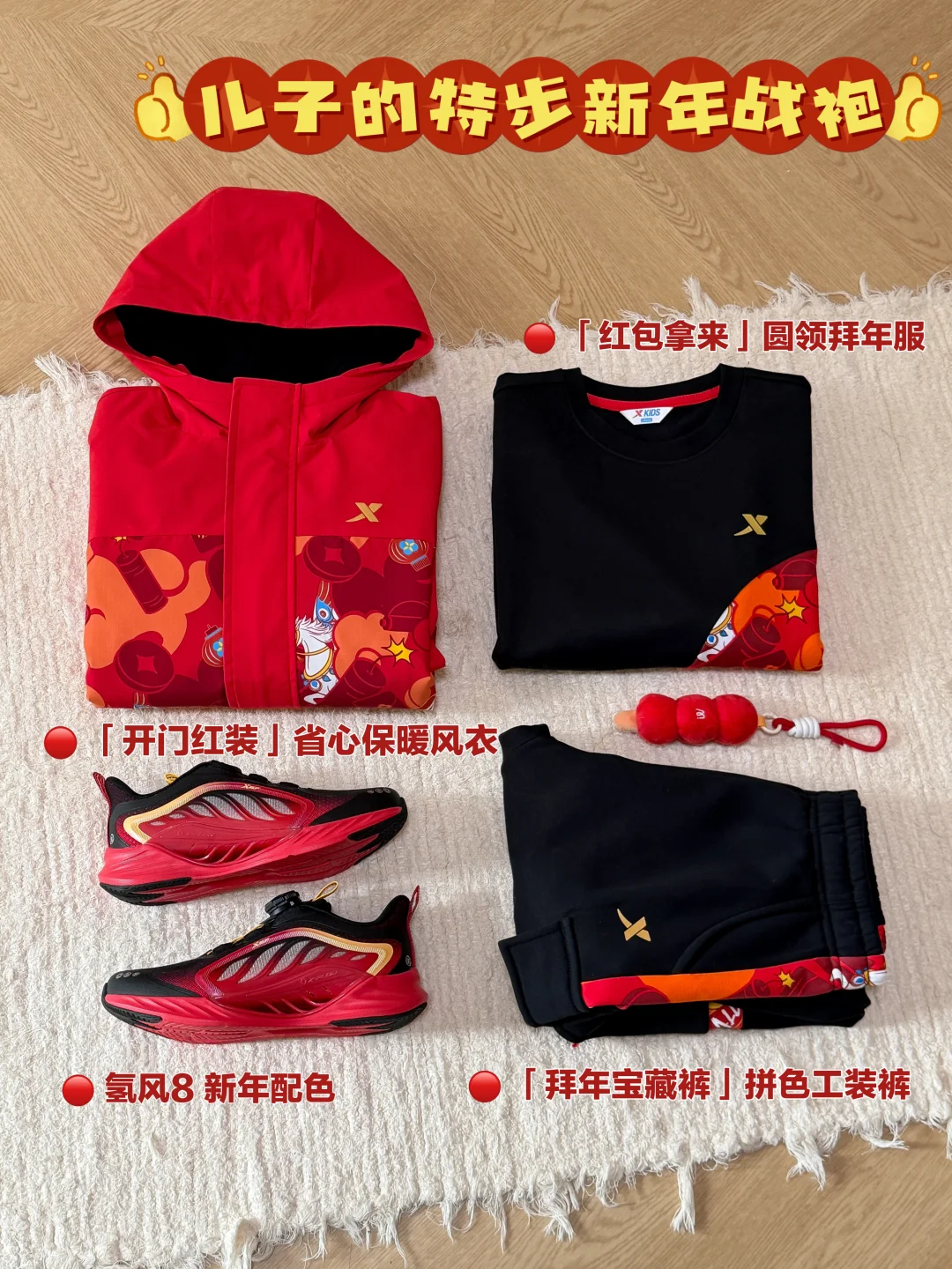 儿子穿起来新年氛围感一整个拿捏👌 老母亲的既要又要全满足~ 这件福气满满🈵️的特步少年保暖风衣我真的爱住~ ✅三防面料(防泼水+防油+防污) ✅外层挡风御寒 内胆摇粒绒持续蓄热🔒 从里暖到外~ 两个大红口袋🧧 过年走亲戚,红包再多也不怕装不下😏 还给他配了一套密热绒卫衣卫裤~ 轻!暖!软!束口设计不漏风❄️ 撞色拼接➕纳福大口袋,新年氛围感拉满🧨 鞋子也是新年红配色🥾 轻便护足,跑跳拜年一整天也不怕累jiojio啦~ 搞定儿子新年ootd👦~ 年味十足又出片📸 夸夸自己💯
