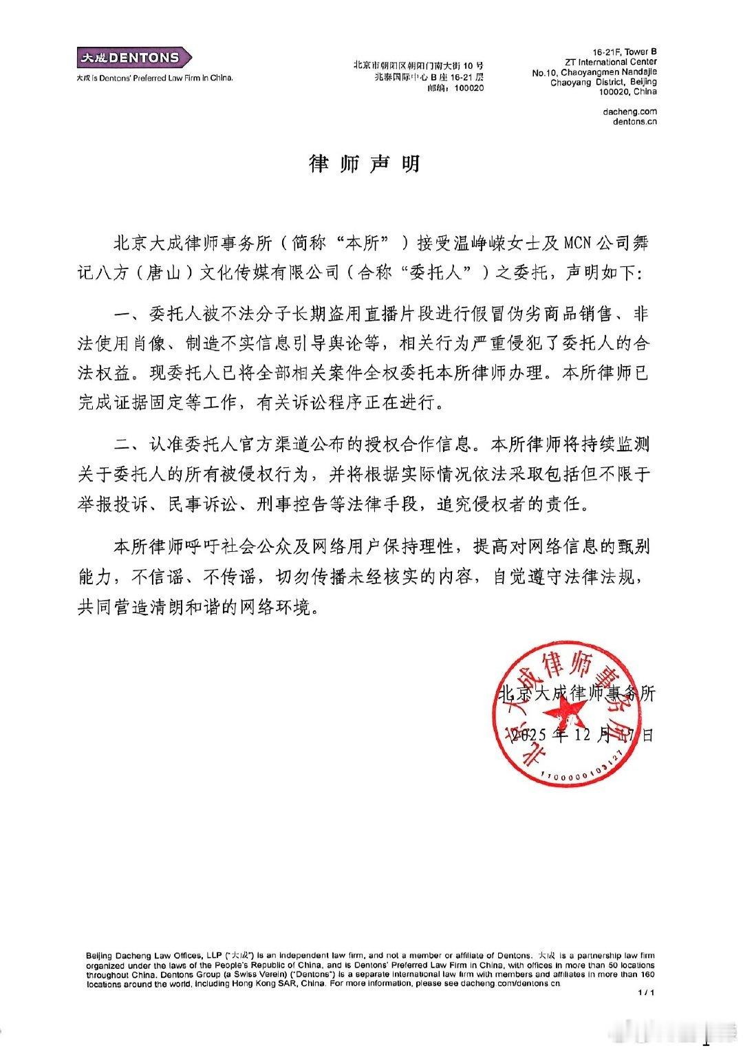 温峥嵘律师声明温峥嵘发律师声明 温峥嵘律师声明!温峥嵘发律师声明:“一、委托人被不法分子长期盗用直播片段进行假冒伪劣商品销售、非法使用肖像、制造不实信息引导舆论等,相关行为严重侵犯了委托人的合法权益。现委托人已将全部相关案件全权委托本所律师办理。本所律师已完成证据固定等工作,有关诉讼程序正在进行。二、认准委托人官方渠道公布的授权合作信息。本所律师将持续监测关于委托人的所有被侵权行为,并将根据实际情况依法买取包括但不限于举报投诉、民事诉讼、刑事控告等法律手段,追究侵权者的责任。”