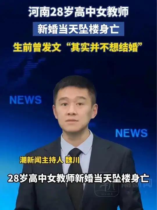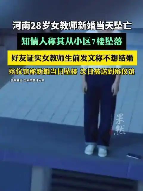 28岁女教师婚礼日坠楼,背后是沉重的枷锁 2025年12月10日,本应是河南鲁山县28岁女教师魏亚蕊幸福步入婚姻殿堂的日子,却成了她生命的终点。 魏亚蕊以优异成绩考入鲁山一高任教,在学生眼中,她温柔佛系,爱穿中式风衣服,身材高挑匀称,尽显明媚。然而,她长期被父母催婚,抗争7年无果。婚礼前一天,她曾发朋友圈取消婚礼,称礼金会返还,可因父母不同意、不愿退彩礼,婚礼照常。 当天,她未梳妆、穿日常衣服坐上婚车。到婆家新房后,借口换婚纱反锁房门,十分钟左右便坠楼身亡。她在遗言中倾诉着被催婚的绝望,对父母、亲戚和未婚夫的不满。 这起悲剧令人痛心,也引发深思。婚姻本应是幸福的起点,却成了她无法承受之重。愿魏亚蕊安息,也希望类似的悲剧不再上演。