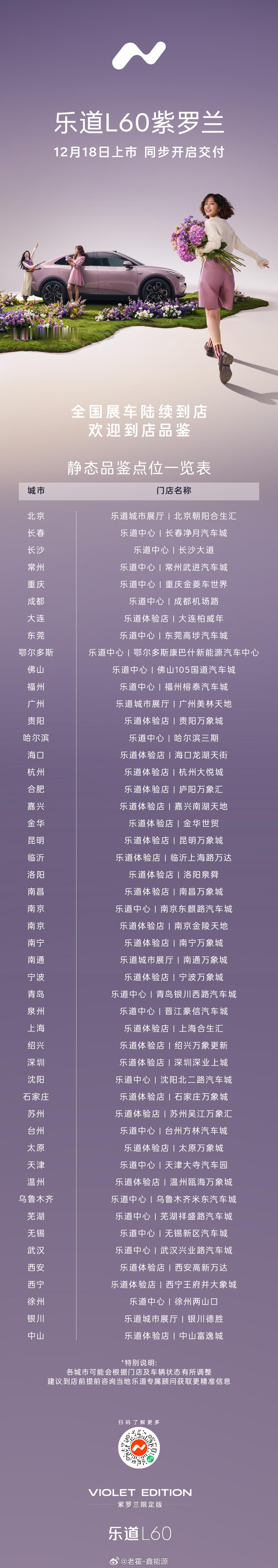 乐道L60紫罗兰限量发售,黑骑士之后的又一限定版。在颜色这一块,紫罗兰版本相当优秀,特别是它这个内饰配色,太绝了,我打赌女孩子一眼就会被吸引。抓紧去店里看看吧,图2就是有展车的门店。乐道L60紫罗兰大V聊车