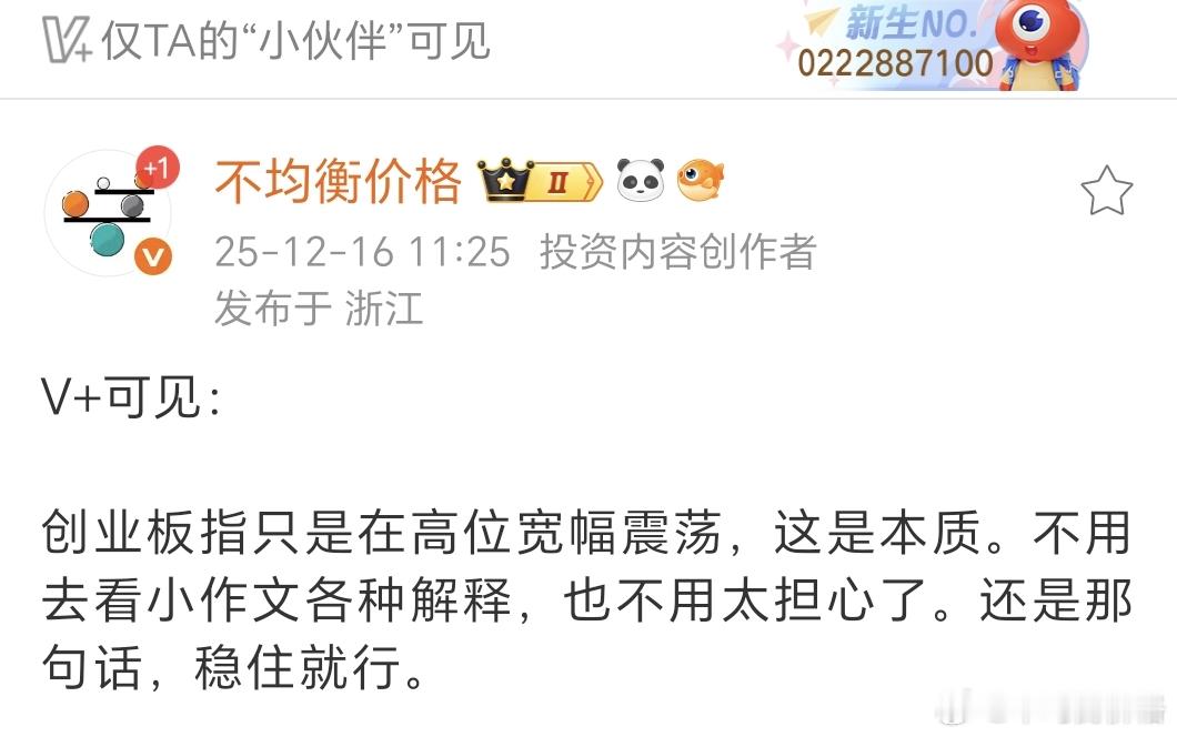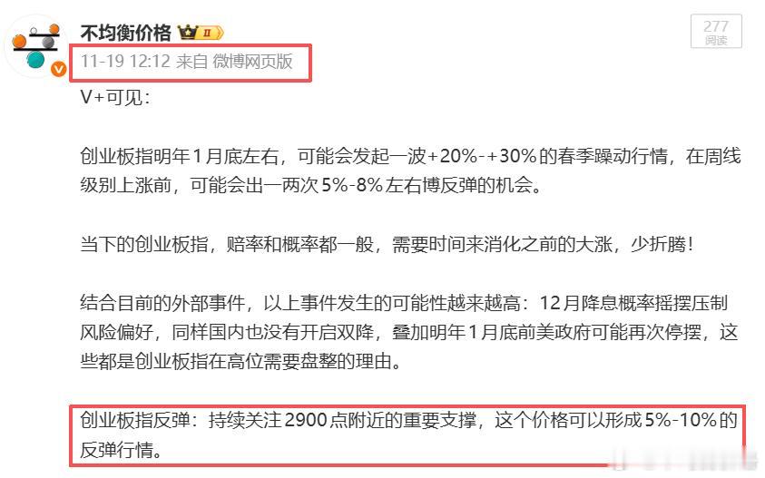 交易的核心是推演与应对,11月中旬以来,创指走势完全符合我的推演。创业板这一个月的剧本,我早在11月19日就在V+可见中写好了。(图2)11月19日,创业板指大跌之前,我明确指出 2900点支撑,并预判5%-10% 的反弹。11月21日创指大跌4%,11月24日下探至2892点,众人恐慌、高喊指数破位。而随后,创业板指如我所料开启反弹,+10%完美兑现。(图1)12月8日创业板指触及近期高点,我在群里紧急提醒对创指要谨慎。随后几天下跌,到昨天,市场开始传播鬼故事,而我并不意外。昨天再强调,要清晰认识当前指数走势的本质,是宽幅震荡,仅此而已。接下来的剧本怎么走? 很多人问:调整结束了吗?还能上车吗? 真正的交易体系,不是靠猜,而是靠推演。最重要的那张推演图,我在12月8日已经在群内发布(图3),目前不需要更新。年底了,耐心在震荡中播种,等待2026的丰收。私密券
