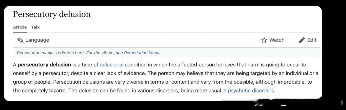 我:“几十年喊中国崩溃论你们不累吗?”田纳西白男:“中国从2000年开始每年都说要征服我们,你觉得这可笑吗?”(MAGA大胡子娇娃叫喊着“中国欺负我“的画面真的好难看)我:”被迫害妄想症“百科截图.JPG田纳西白男:“你看你无话可说了吧”。(MAGA大胡子娇娃旋转跳跃赢学舞蹈的画面真的好难看)有时候我真的很疑惑阿美人民义务教育期间究竟学了些啥
