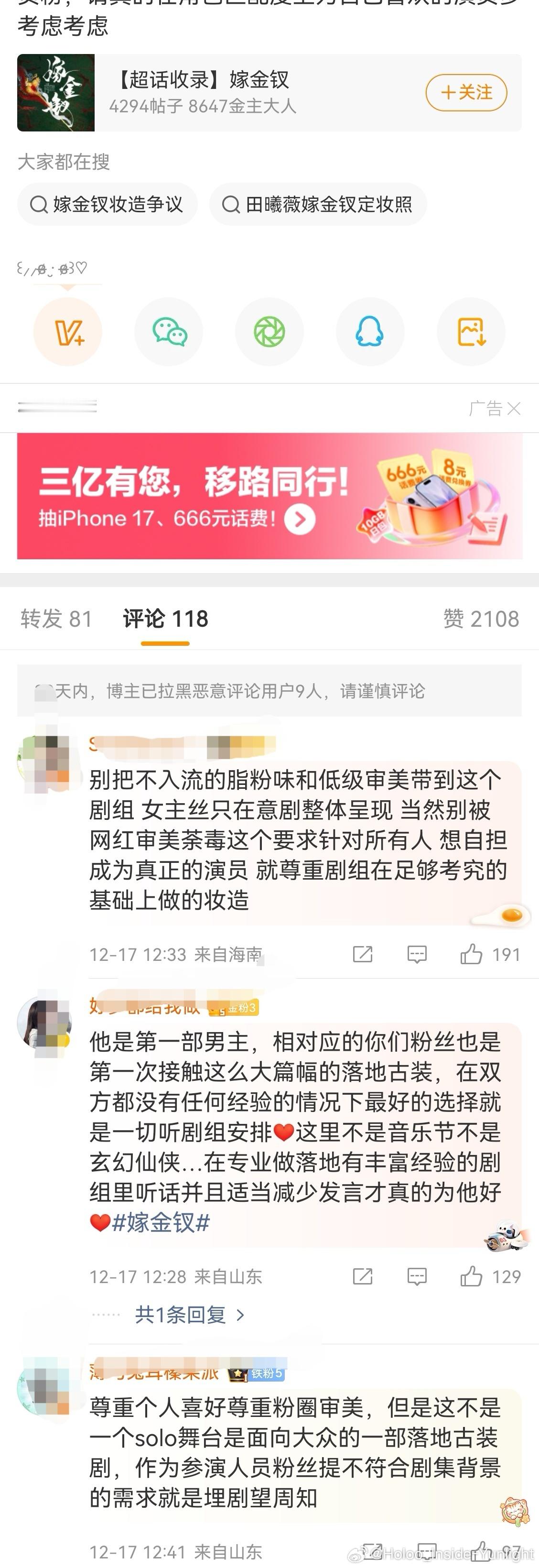 田曦薇粉丝就男主妆造问题向《嫁金钗》剧组提建议,觉得男主妆造不符合角色将军形象,
