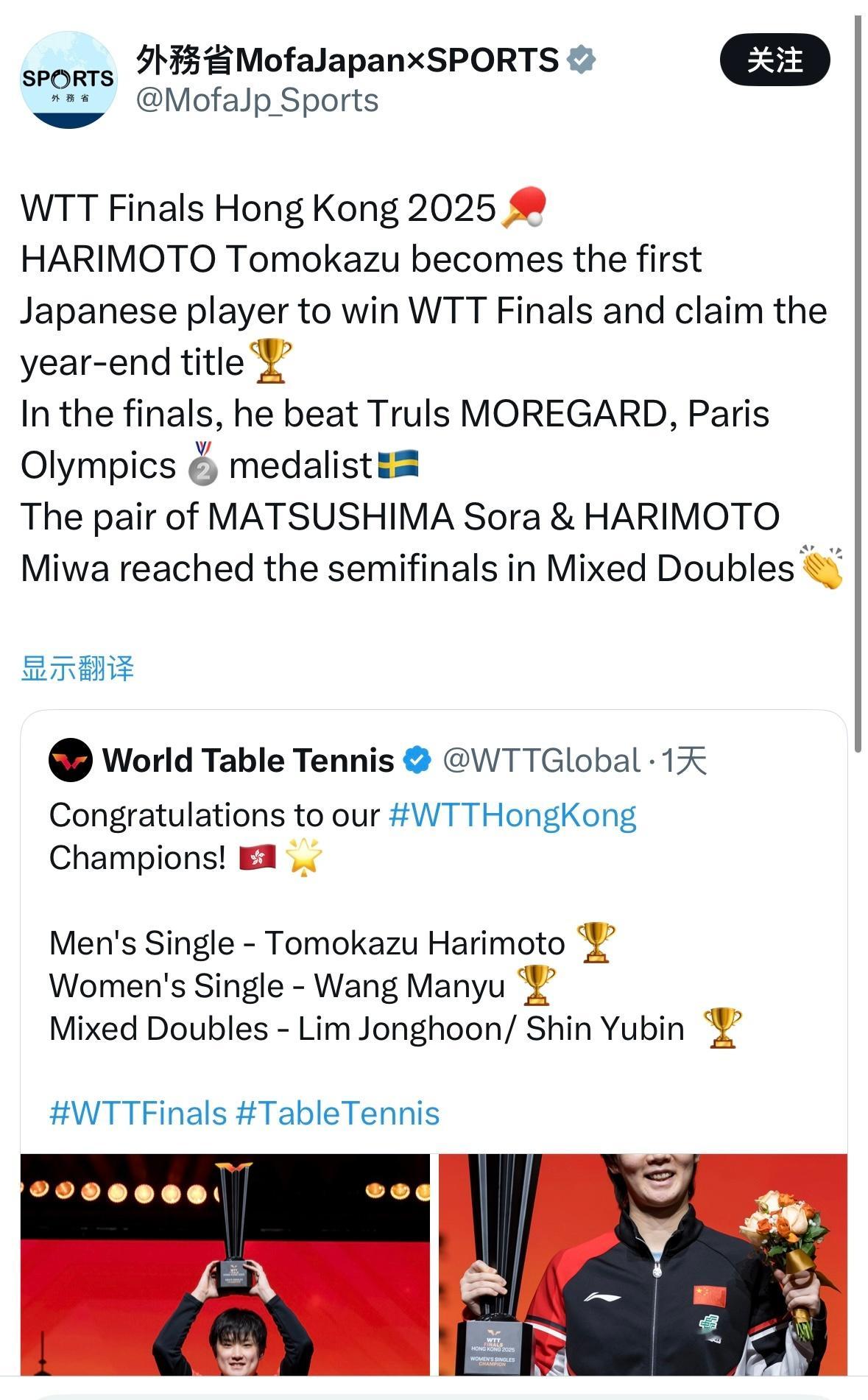 张本智和张本智和wtt香港总决赛202520251217X转帖提及cr. MofaJp_sports(外務省Sports)【WTT香港总决赛2025🏓】张本智和选手在第四次挑战中,成为首位夺得WTT总决赛冠军的日本选手,同时加冕年度王者🏆在决赛中,他战胜了巴黎奥运会银牌得主、来自🇸🇪瑞典的莫雷加德选手✨本届赛事也成为日本选手大放异彩的一站👏