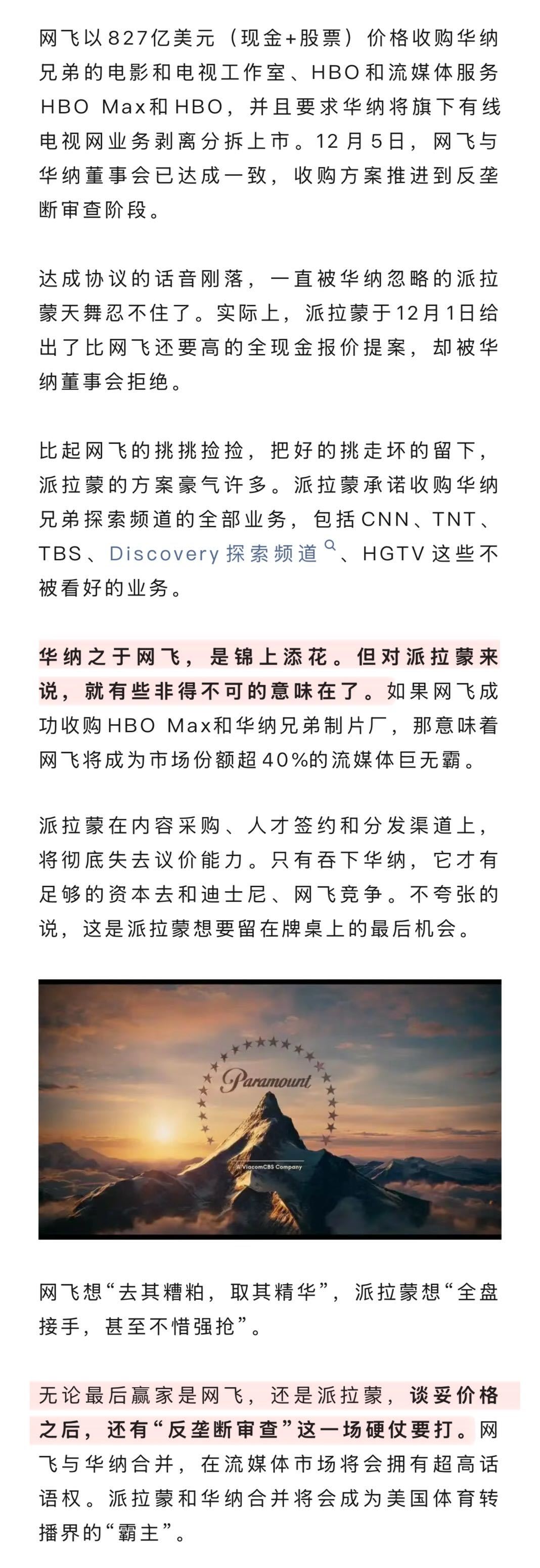 华纳兄弟为何要卖身好莱坞未来格局网飞看上的是华纳的影视工作室和核心IP。 网飞收购华纳为自己干掉一个流媒体对手HBO,还拥有了HBO高质量制作团队。网飞将来可以优化重叠业务,网飞预计可以省下20亿到30亿美元。