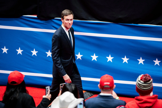 贾里德・库什纳走过悬挂着爱国装饰彩旗的舞台,目光投向观众席。这位美国总统特朗普的女婿在特朗普第一任期结束后不久,便创立了自己的投资公司亲和资本。