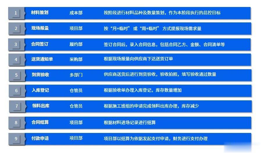 二、合作背景随着建筑行业数字化转型进程加快,以及企业对于精细化管理、降本增效的要求不断提升,湖北工建公司在规模化发展中,逐渐面临传统物资管理模式的诸多瓶颈。1.公司业务覆盖多领域、项目分布范围广,由于缺乏数字化管理系统,物资管理工作量大,各类数据无法实时掌握,人工管理出错率高。2.物资预算编制多依赖经验判断,与项目实际施工需求存在脱节现象;同时采购流程审批环节繁琐,多以线下流转为主,审批效率低下,常出现因审批延误影响物资及时供应的问题。3.材料成本超支问题较为突出,直接挤压了企业的利润空间。由于缺乏有效的管理手段,成本超支风险不能及时发现,管控措施滞后,只能事后补救。
