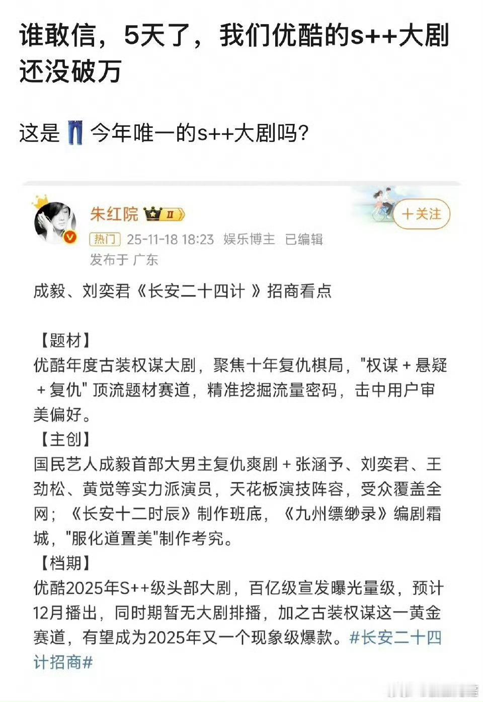 放在一起看真的是太有节目效果了现在看来长安24计虽然没有打破正数第一的记录,但是拿到S+制作大剧倒数第一的记录还是有希望的。