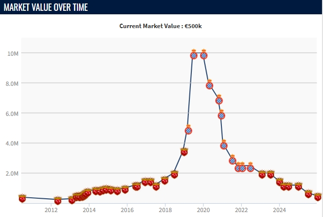 武磊的身价曾在2019年效力西班牙人时期,达到巅峰的1000万欧,至今仍是中国球员身价历史第1。