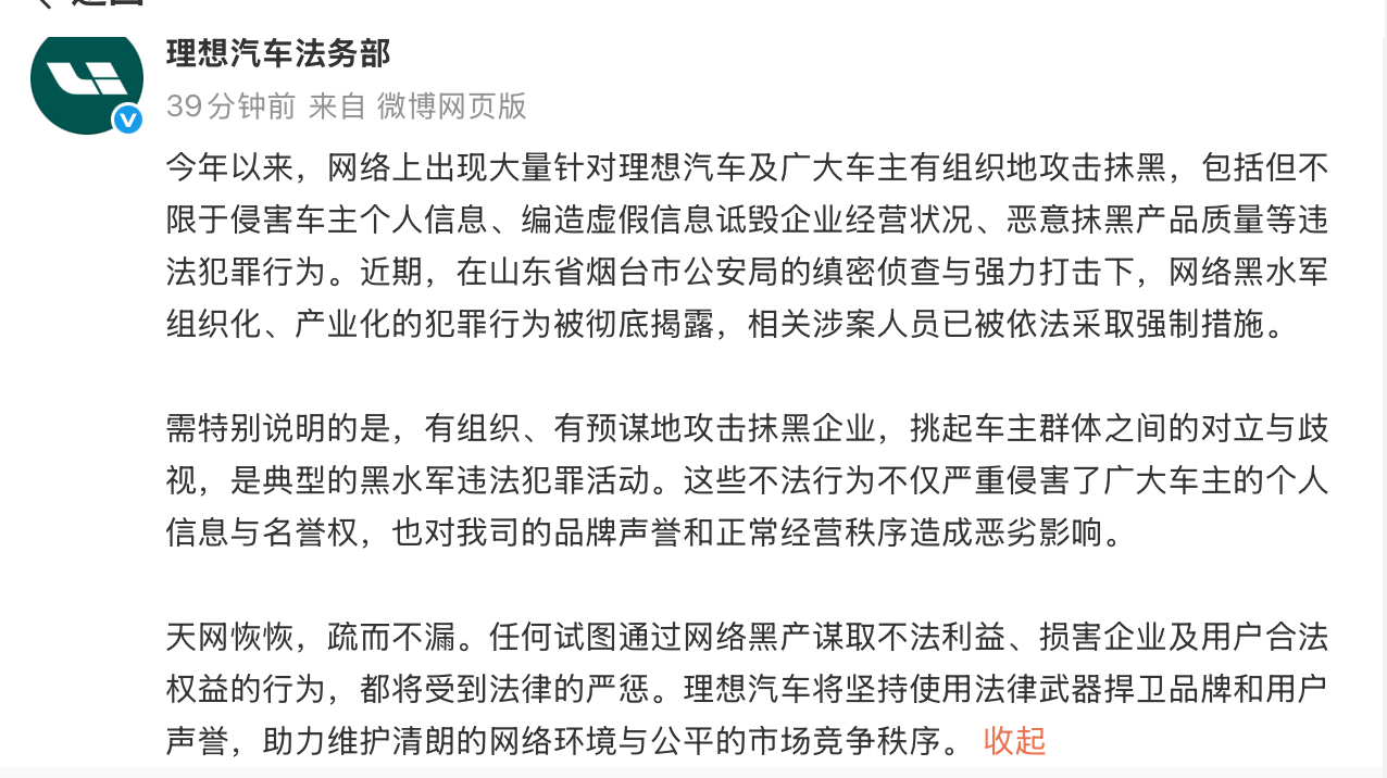 对此,理想法务部发文称,任何试图通过网络黑产谋取不法利益、损害企业及用户合法权益的行为,都将受到法律的严惩。理想汽车将坚持使用法律武器捍卫品牌和用户声誉,助力维护清朗的网络环境与公平的市场竞争秩序。