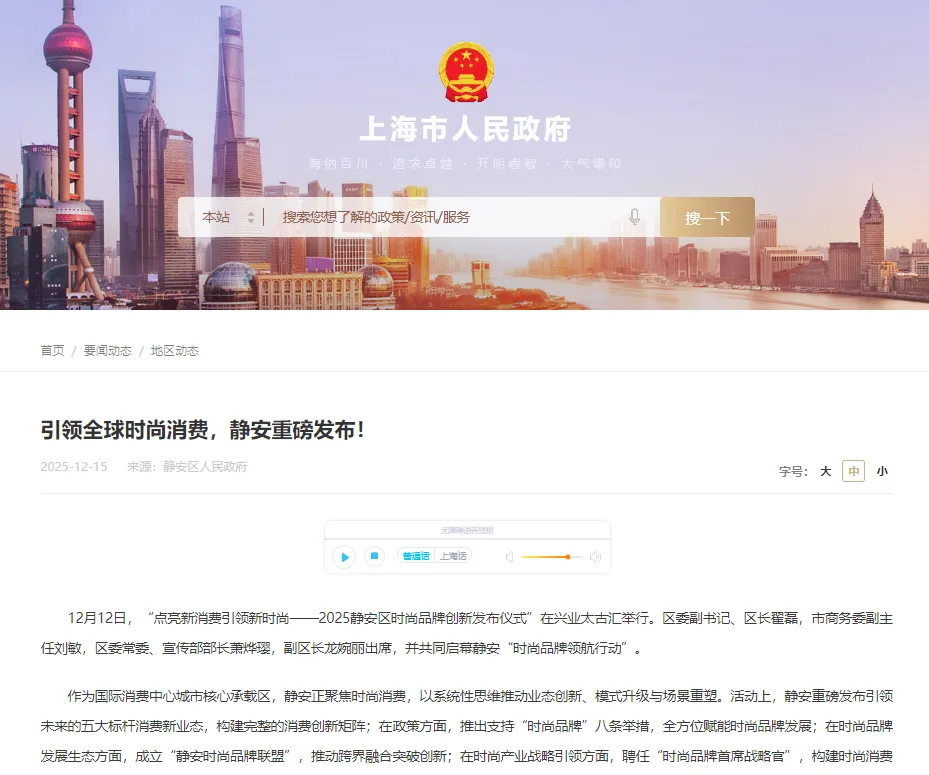 12月12日,“点亮新消费引领新时尚——2025静安区时尚品牌创新发布仪式”于兴业太古汇举办。活动期间,静安区面向社会公布了将大力吸引与培育的五大消费新模式、新业态和新场景,同时推出全国首个支持时尚品牌的“八条举措”。