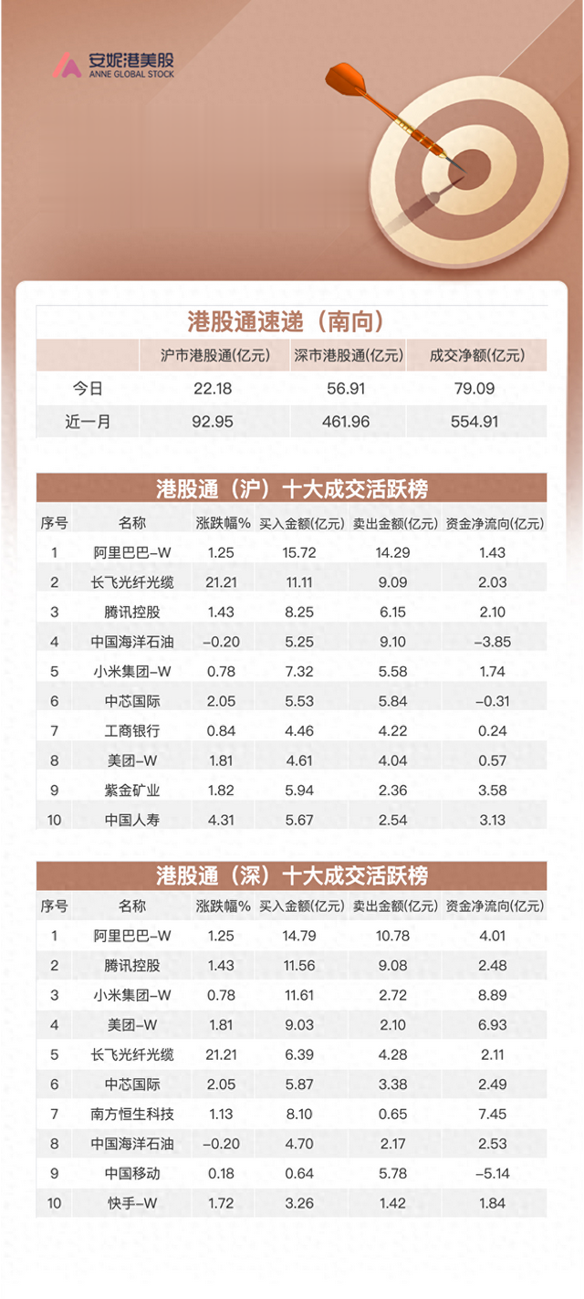 港股今日反弹拉升,南向资金全天大幅净买入约79.09亿港元,为近三周以来单日新高。其中,沪港股通净流入约22.18亿港元,深港股通净流入约56.91亿港元。