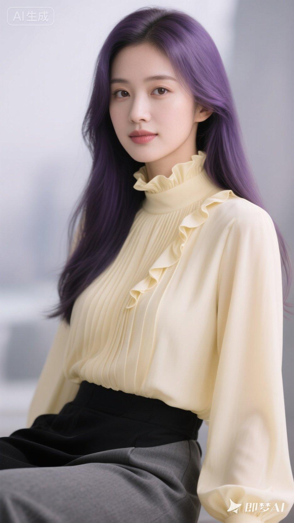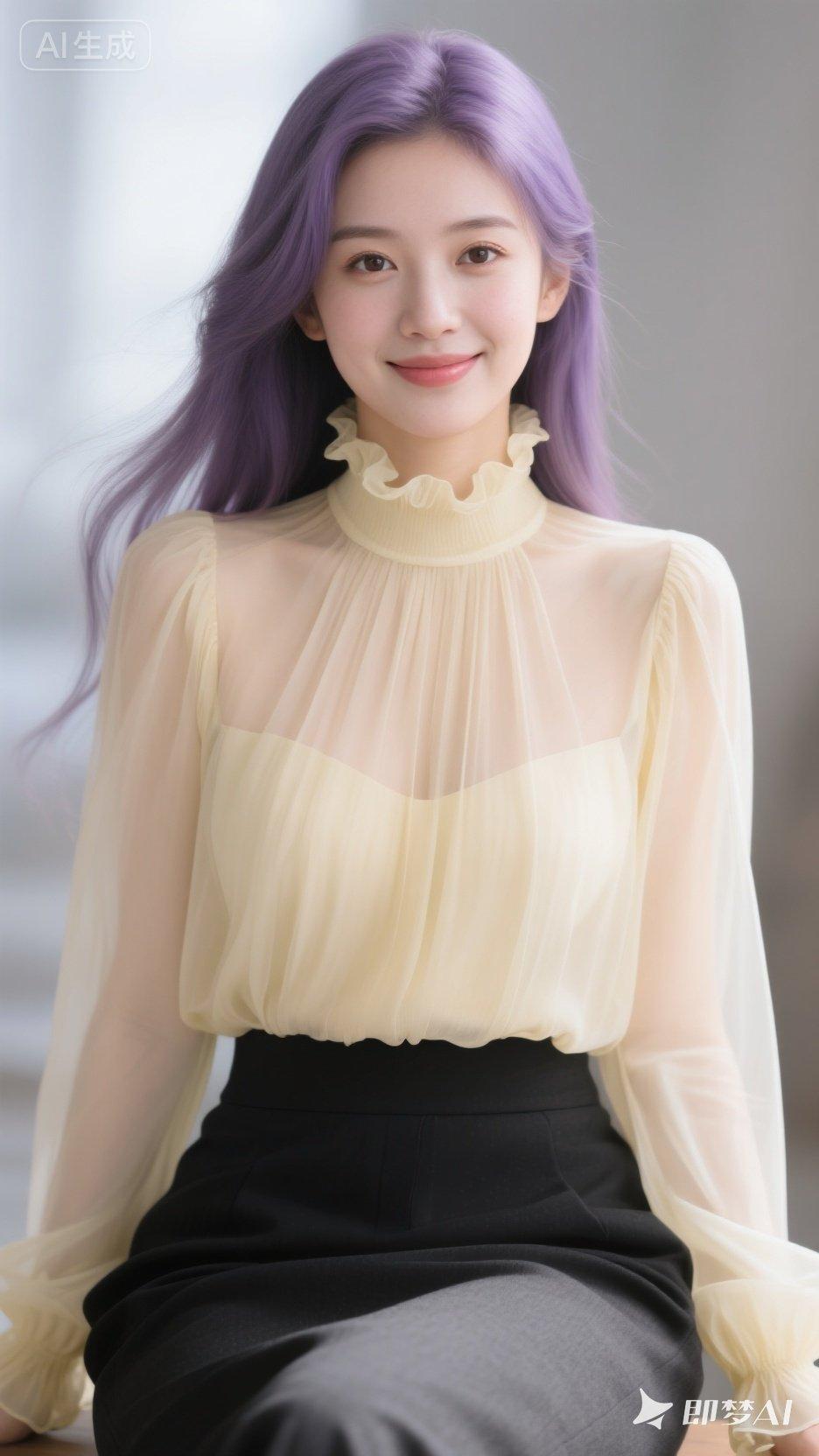 梦幻紫发少女,温柔微笑,时尚穿搭,清新自然