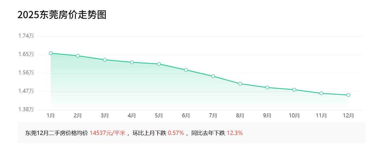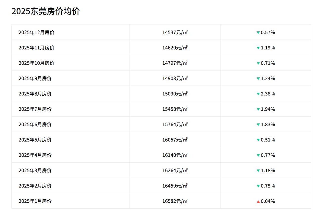 2015年11月,东莞房价均价8411元; 2016年11月,东莞房价均价11091元; 2017年11月,东莞房价均价13763元; 2018年11月,东莞房价均价14956元; 2019年11月,东莞房价均价15920元; 2020年11月,东莞房价均价17775元; 2021年11月,东莞房价均价20097元; 2022年11月,东莞房价均价22525元; 2023年11月,东莞房价均价21405元; 2024年11月,东莞房价均价16738元; 2025年11月,东莞房价均价14620元。 回顾东莞十年的房价,2025年11月的14620元相比2015年11月的8411元,增长了6209元,涨幅达73.82%。相比2025年1月的16582元,下降了1962元,环比2025年10月的14797元,下降了177元。 2025年前三季度,东莞GDP达9318.93亿元,按不变价格计算,同比增长4.5%。其中,第一产业增加值23.51亿元,同比增长4.3%;第二产业增加值5194.46亿元,同比增长4.5%;第三产业增加值4100.97亿元,同比增长4.4%。 截至2024年末,东莞市常住人口约1057万人,同比增长18.7万人。全市常住人口城镇化率约为93%,位居全国城市第四。全市城市人口结构十分年轻,2020年第七次人口普查显示,东莞常住人口平均年龄33.4岁,仅次于深圳。 东莞房价2025年11月比2025年1月下降了1962元,下降幅度不小,价格基本上回归到2018年水平。不过也得看区域,核心区域的房价不降反增,远郊地区房价下跌明显,拉低了整体平均价格。 那么,在刚刚过去的11月份,大家对东莞的楼市有什么切身的体会,咱们在评论区聊一聊。 数据说明:以上均价数据,均来自安居客数据,仅作为分析参考,旨在反映东莞近十年的房价走势,不能准确映射当地实际房产价格。因为新房、二手房、不同区域不同位置的房价差别较大,占比也不同,仅通过一个均价不能一概而论。