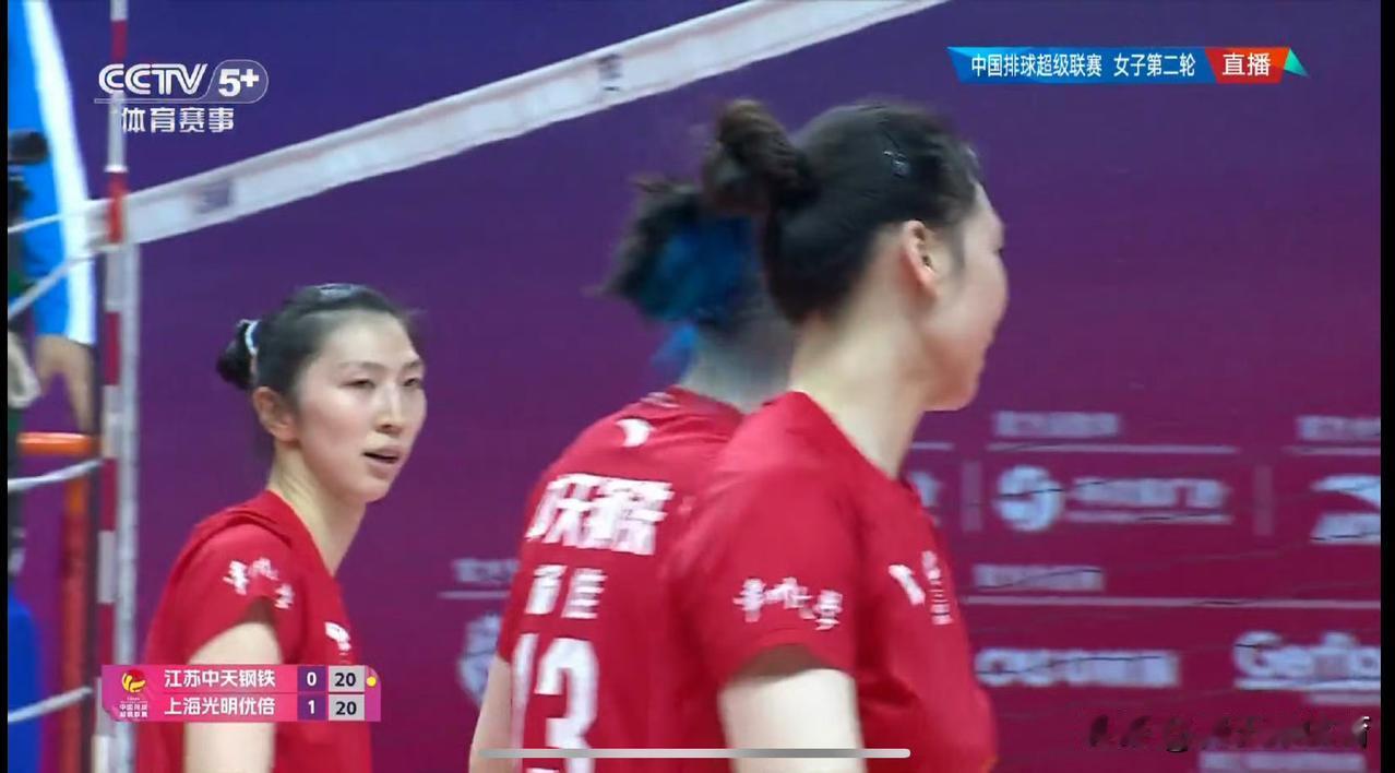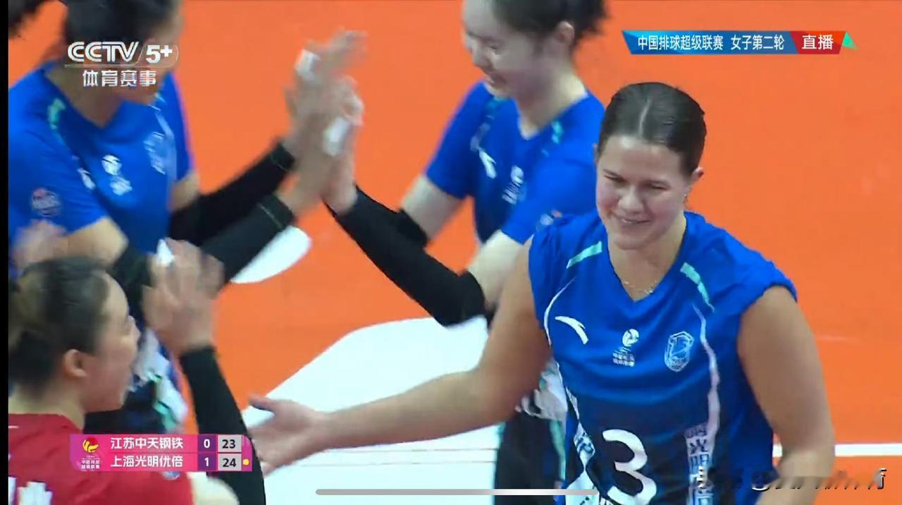 江苏女排打到现在,真的就靠吴梦洁一个人啊[流泪]范泊宁要一传没一传,要进攻没进攻,还老是失误送分,唐欣遇到高拦网也打不出来了!第二局7-14落后,到局末追平比分,也真的是不容易,张籽萱尽全力了,23平后,范赖克的发球直接带走比赛!上海女排俩外援的实力在这场比赛体现出来了,沃龙科娃真的非常适合这支上海女排,范赖克的发球也发出来了,预测3-0赢江苏!