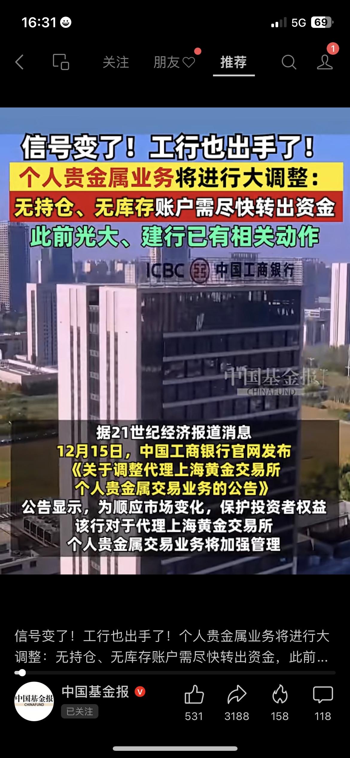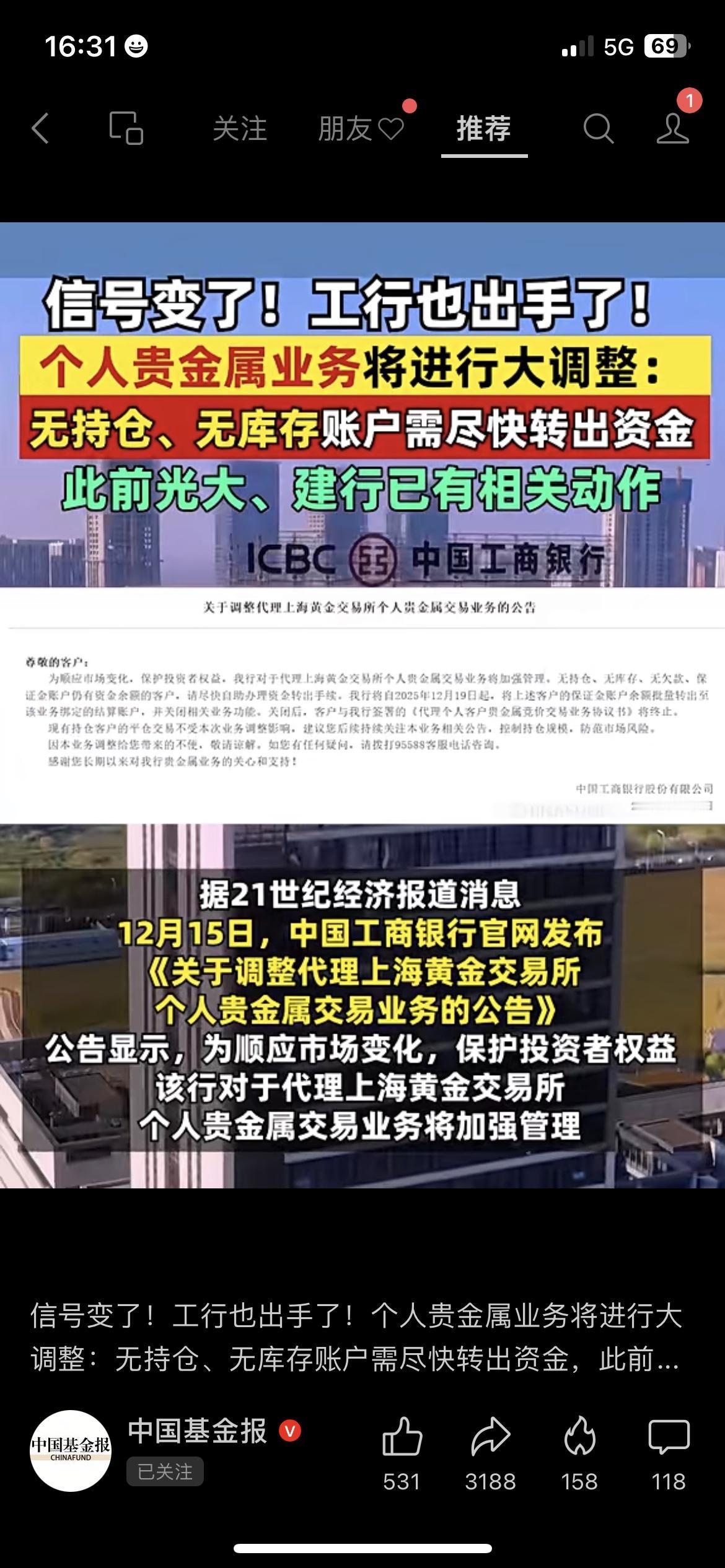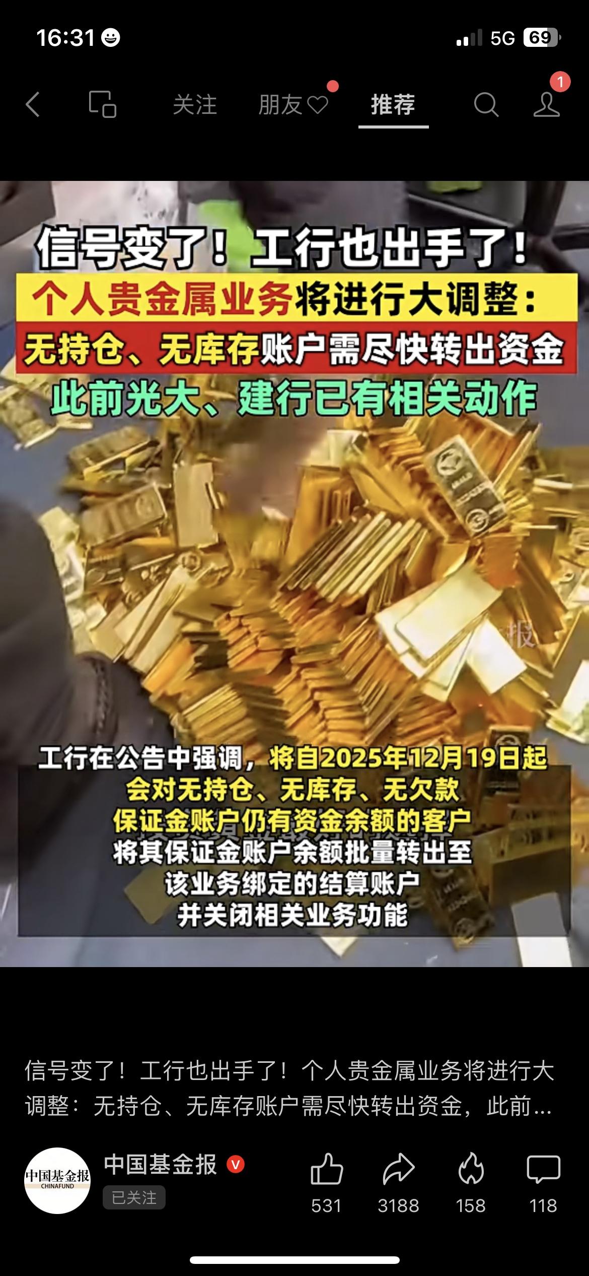 工行调整贵金属业务,无持仓账户赶紧转资金 咱买过工行贵金属的老百姓赶紧看,政务平台刚更新通知了! 12月19日起,工行会把无持仓、无库存账户的资金批量转出,还会关闭相关业务。 其实很简单,咱有这类账户的,先打开工行APP把资金转出来,别白跑线下网点。 我妈去年开的贵金属账户没持仓,我刚帮她把钱转出来,一步就搞定。 你在工行有贵金属账户吗?评论区说说~