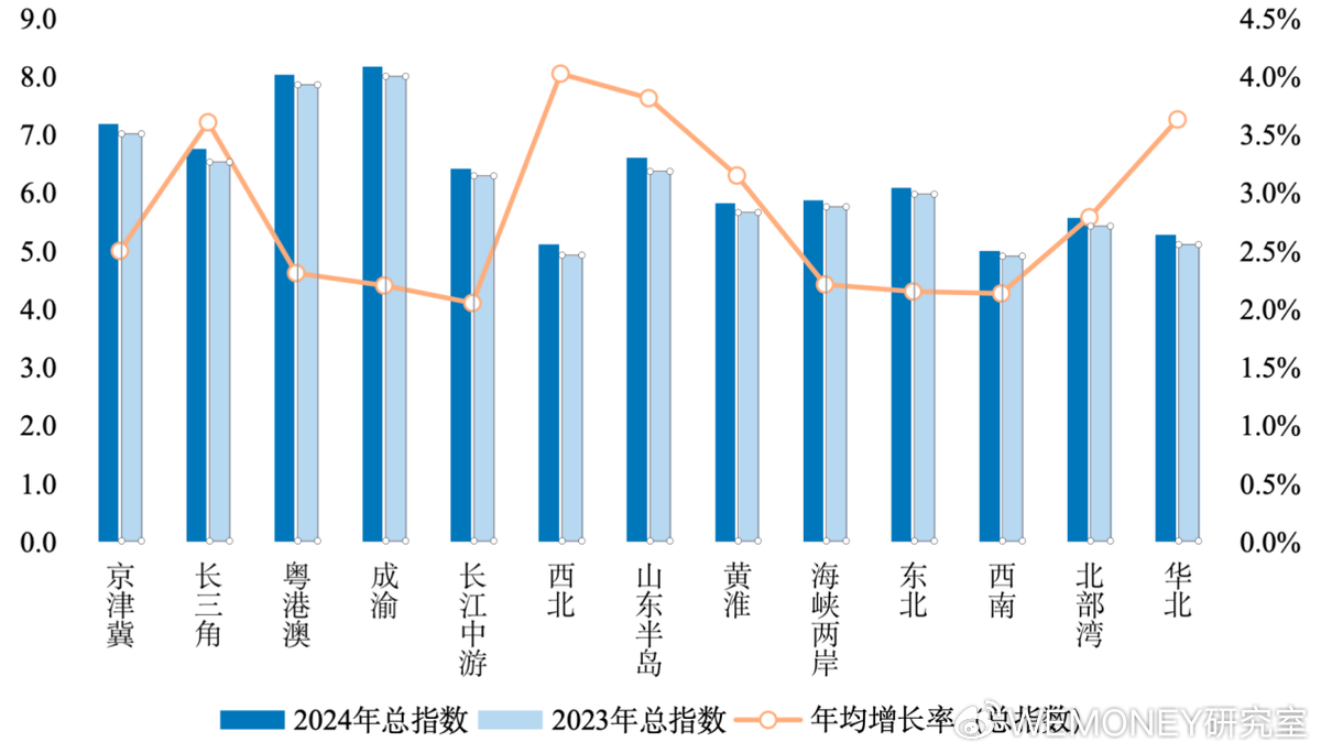 从区域燃指数得分来看,2024年成渝、粤港澳大湾区和京津冀位居前三,与2020-2023年基本保持一致。