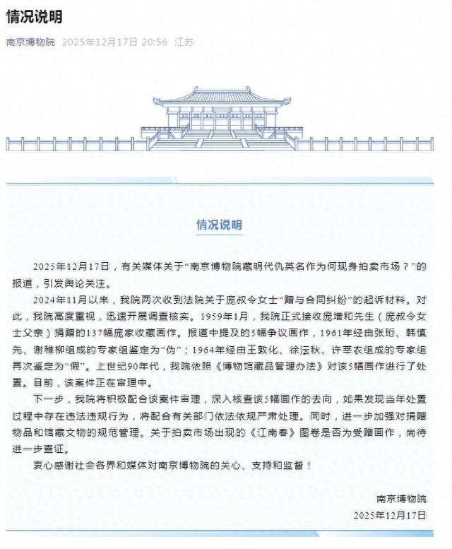2025年12月17日,有关媒体关于“南京博物院藏明代仇英名作为何现身拍卖市场?”的报道,引发舆论关注。