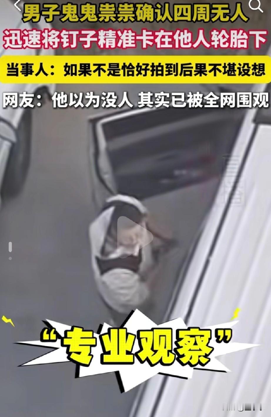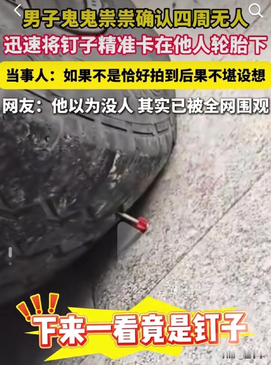 不能放过!上海,一男子把长钉放在车轮下,正好被女子给拍了下来,女子刚以为是放气的,走近一看是一颗长钉子。网友:他以为没人看到,却不知已经被全网的人观看。 女子闲来无事拿手机乱拍,突然就看到有人在自己的旁鬼鬼祟祟的,女子并没有声张,就直接用手机记录了下来。 看到男子在车轮那里捣鼓好一会才走,女子就下去查看,本来以为车轮是被放气了,走进了才发现,车轮下面有一个长钉子,正对准着车轮。 有这种行为,大多数都是有矛盾的,一方为了报复所以才会做出这么缺德的事情来。 幸亏被车主看到了,如果不知道的话,后果是难以想象的。 车主当时也报警了,这种事情虽然不大,但也能拘留几天的了,但车主是个善良的人,本来这个人是要拘留的,看到他可怜,只是教育了一番。 其实, 他的行为一点也不可怜,要是高速行驶中爆胎,后果很严重的,这种人不值得可怜,该怎么罚就得怎么罚!