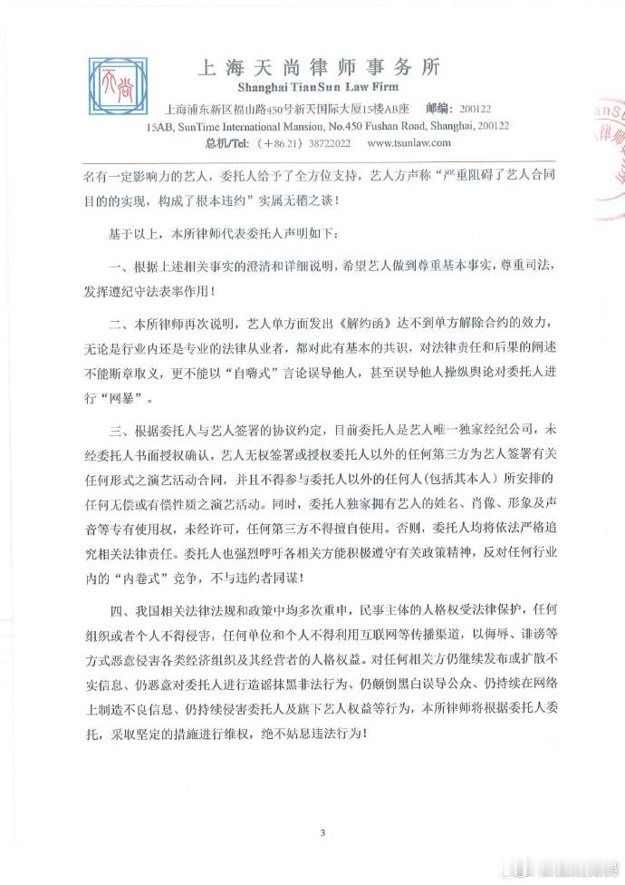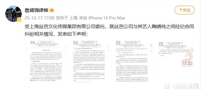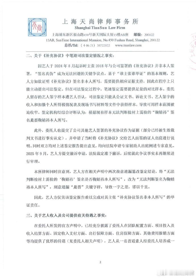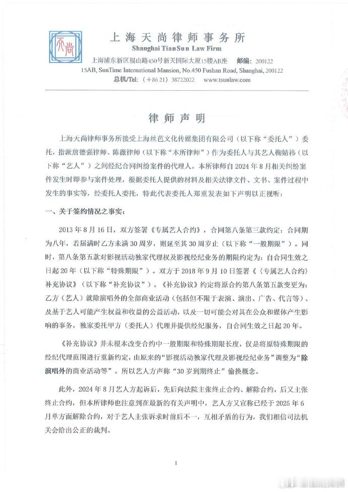 丝芭质问鞠婧祎17日下午,转发声明,质问:如果按鞠婧祎所说合约已自然到期,请问起诉法院主张终止合约、解除合约是为何? 补充协议如果不是本人签名,为何要在司法鉴定报告描述上玩一个字的文字游戏、又为何要主动申请撤诉?社会公众期待一个合理的解释。在律师声明中提到,双方在2013年签署的合约中约定合同期为8年,若届时鞠婧祎未满30岁,则延至30周岁止,同时丝芭对鞠婧祎影视活动代理权和经纪业务为20年。在2018年签署的补充协议中将除演唱外的全部商业活动代理权给丝芭,合同期为20年。对于鞠婧祎方提出的“笔迹造假”情况,声明中称,鞠婧祎方故意遗漏篡改鉴定结论,将“无法判断检材上需检的‘鞠婧祎’签名是否鞠婧祎本人所写”,改为“无法判断签名为鞠婧祎本人所写”。鞠婧祎丝芭 20年合约