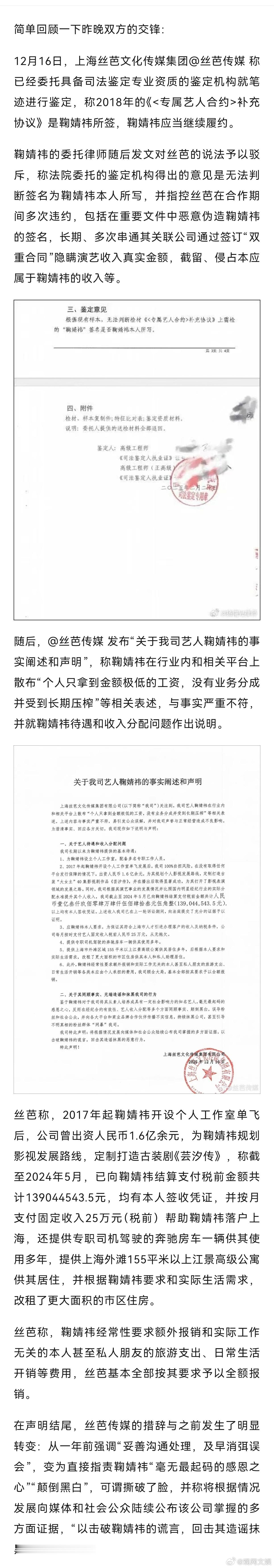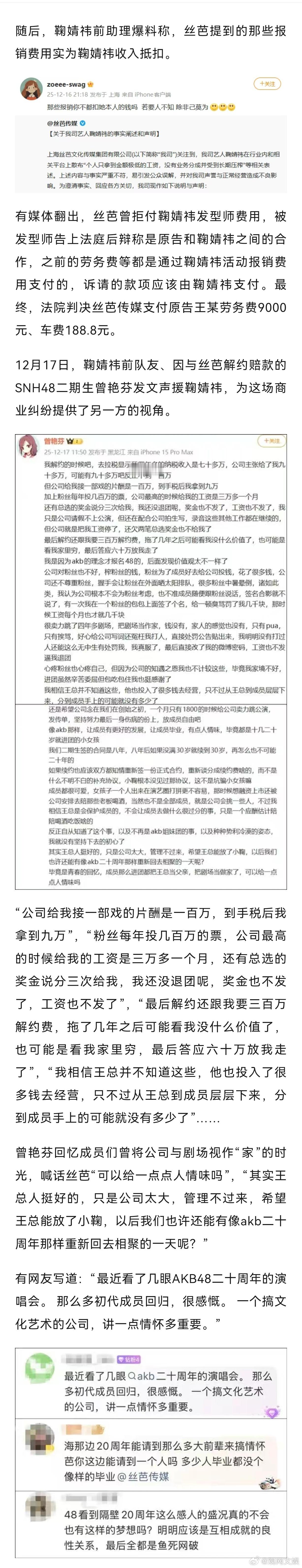 【丝芭晒鞠婧祎上亿“工资单”背后,经纪公司与头部偶像的“生死绑定”】丝芭鞠婧祎纠纷反映偶像产业困境丝芭为什么不放鞠婧祎12月16日晚,“鞠婧祎收入”“丝芭称已支付鞠婧祎超1.39亿”等话题接连冲上热搜文娱榜首位。非顶流艺人十年累计税前收入过亿,瞬间引爆网络。这场“一姐”与老东家的解约纠纷,在法庭之外,舆论焦点从双方的合约纠纷偏向了“明星该挣多少”,矛盾就此转移了一部分。走人就得打官司赔钱,几乎是丝芭的“惯例”了,但这一次,当“摇钱树”鞠婧祎熬到30岁等合约期满选择不续约,丝芭却摆出了近乎“鱼死网破”的摊牌架势强留前者。这背后,也能一窥这家依赖粉丝经济立足的公司与头部偶像的“生死绑定”,牵一发而动全身,十几年只培养出鞠婧祎一位真正“出圈”的艺人,丝芭不愿放手,也不敢放手。此事之所以备受关注,是因为它远非个案,折射出的是偶像产业的根本困境:经纪公司与头部艺人之间的利益绑定过深,头部艺人等于此类公司的“核心资产”,一旦分离,对经纪公司来说,不是简单的劳资矛盾,而是涉及商业根本的拼死一搏。鞠婧祎