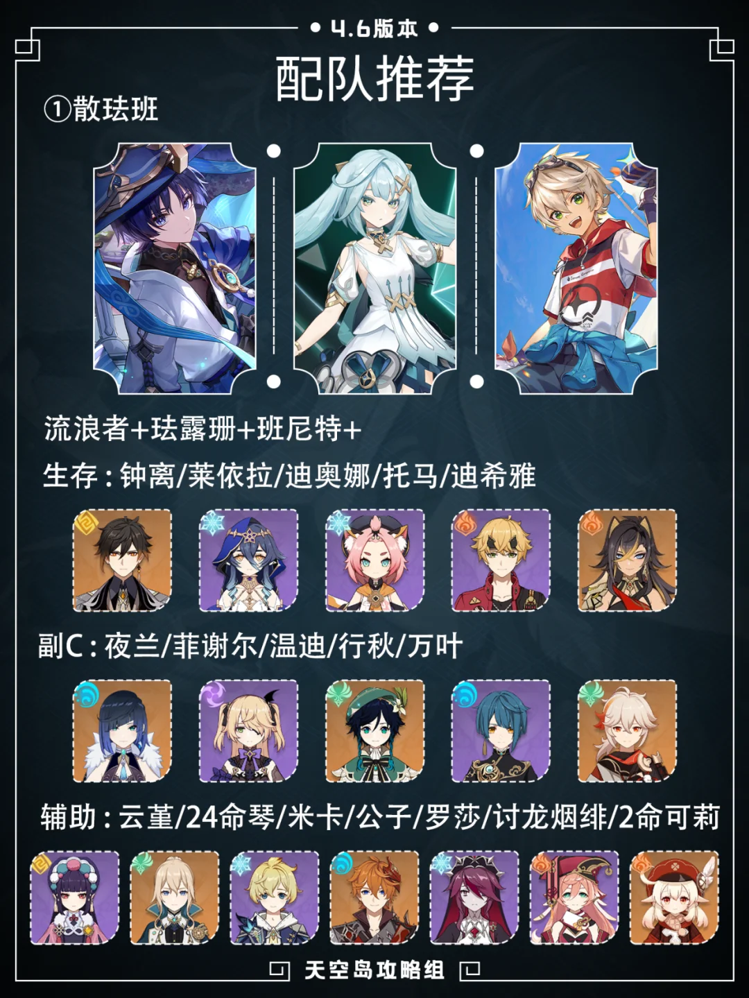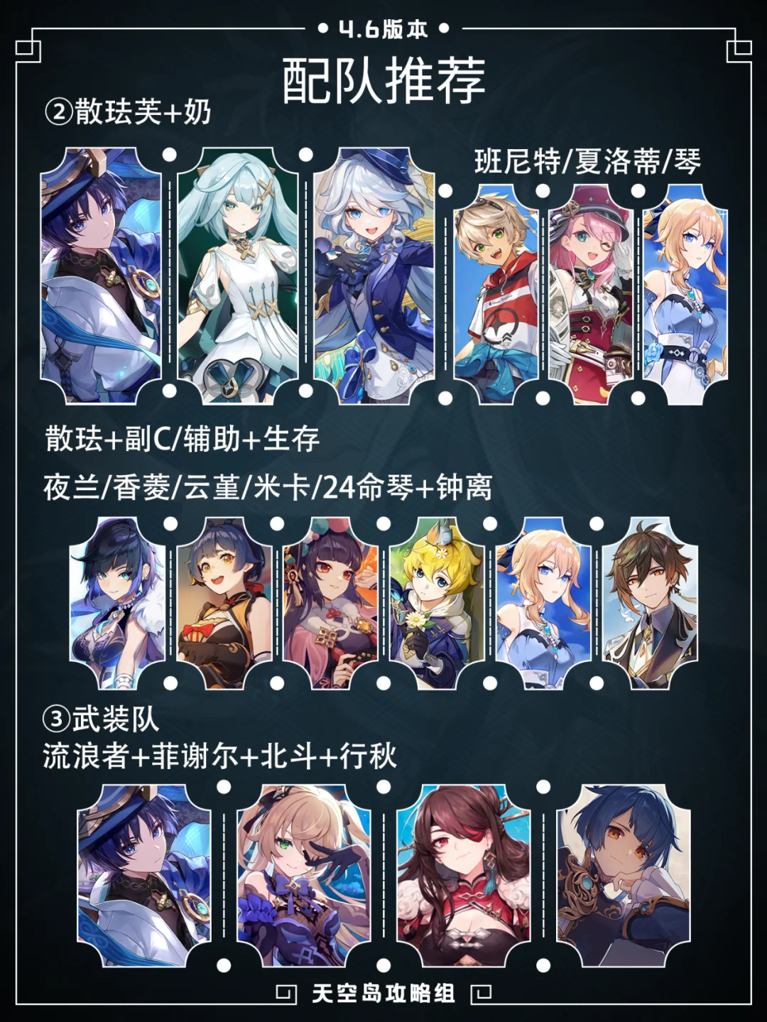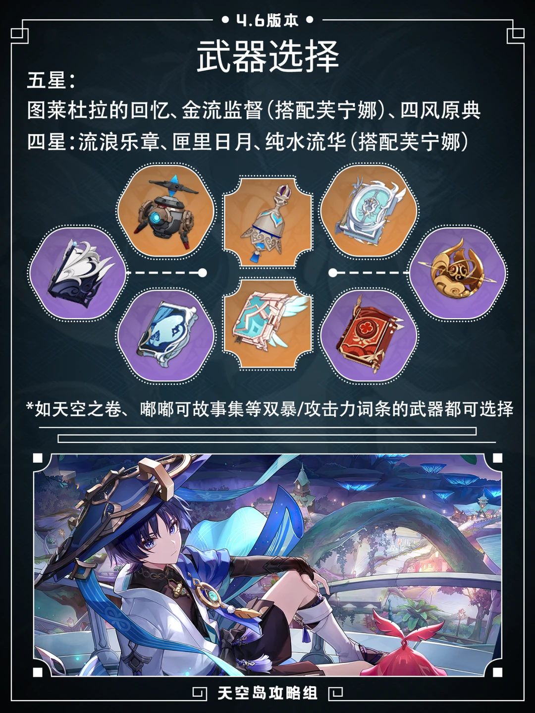 天赋可先提普攻~ 武器选择:五星除专武外可选择金流监督(配合芙宁娜)或者四风原典[哇R] 四星可选流浪乐章、匣里日月或者纯水流华(配芙宁娜) 圣遗物优先选4楼阁:攻击沙、风伤杯、双爆头[赞R] 武器、组队、圣遗物等,你不会的看图就懂!