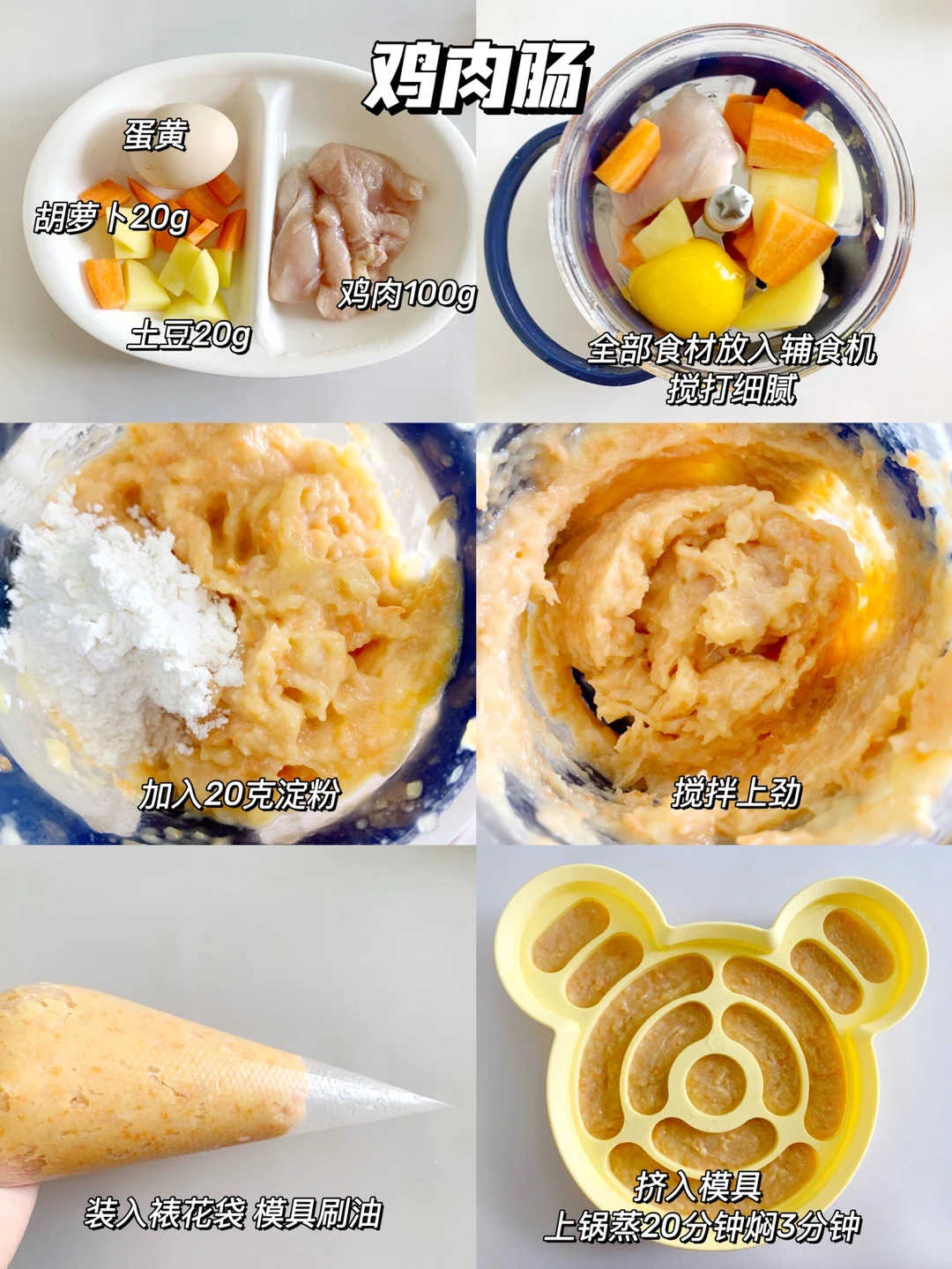 鸡肉肠比例:鸡肉100克、土豆20克、胡萝卜20克、蛋黄1个