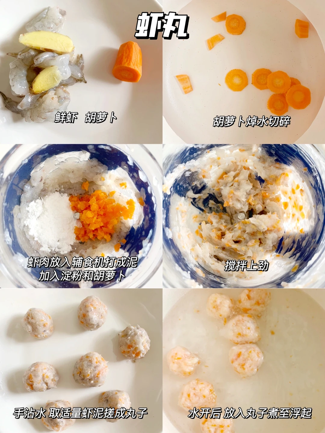 虾丸比例:虾肉80克、胡萝卜20克 、淀粉10克