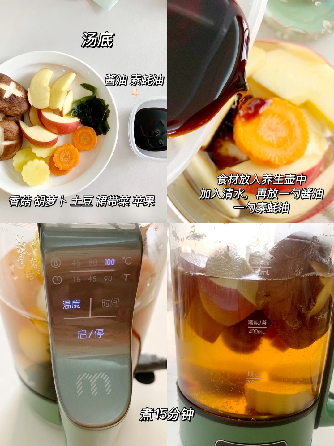 迷你养生壶里加入清水,一勺酱油,少许蚝油,苹果,裙带菜,胡萝卜土豆香菇一起煮15分钟