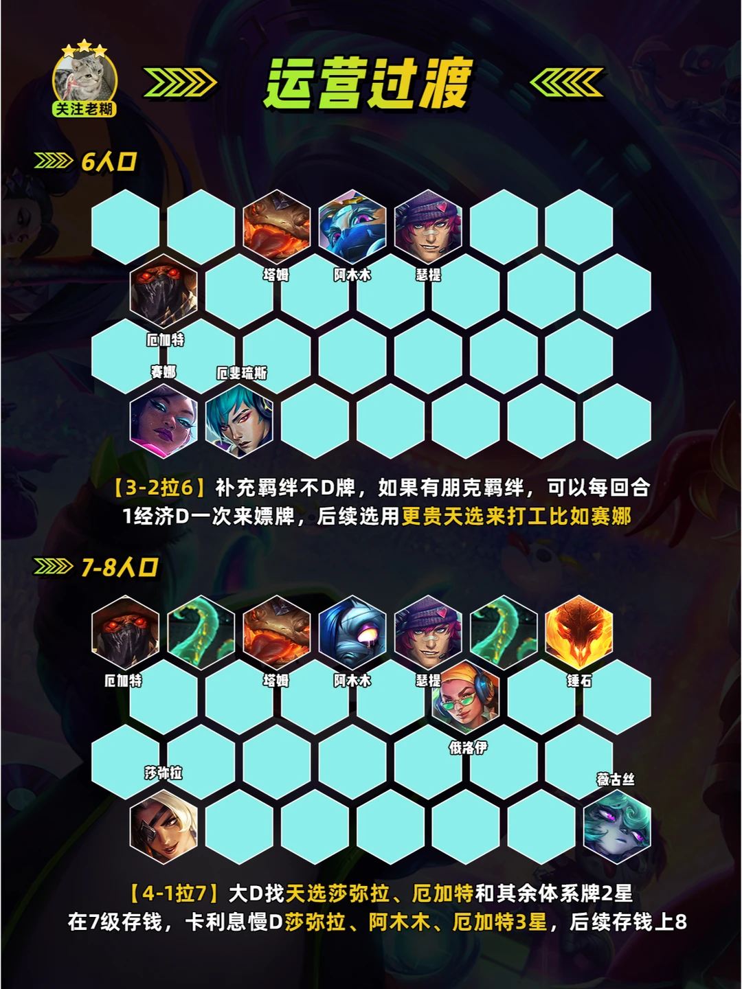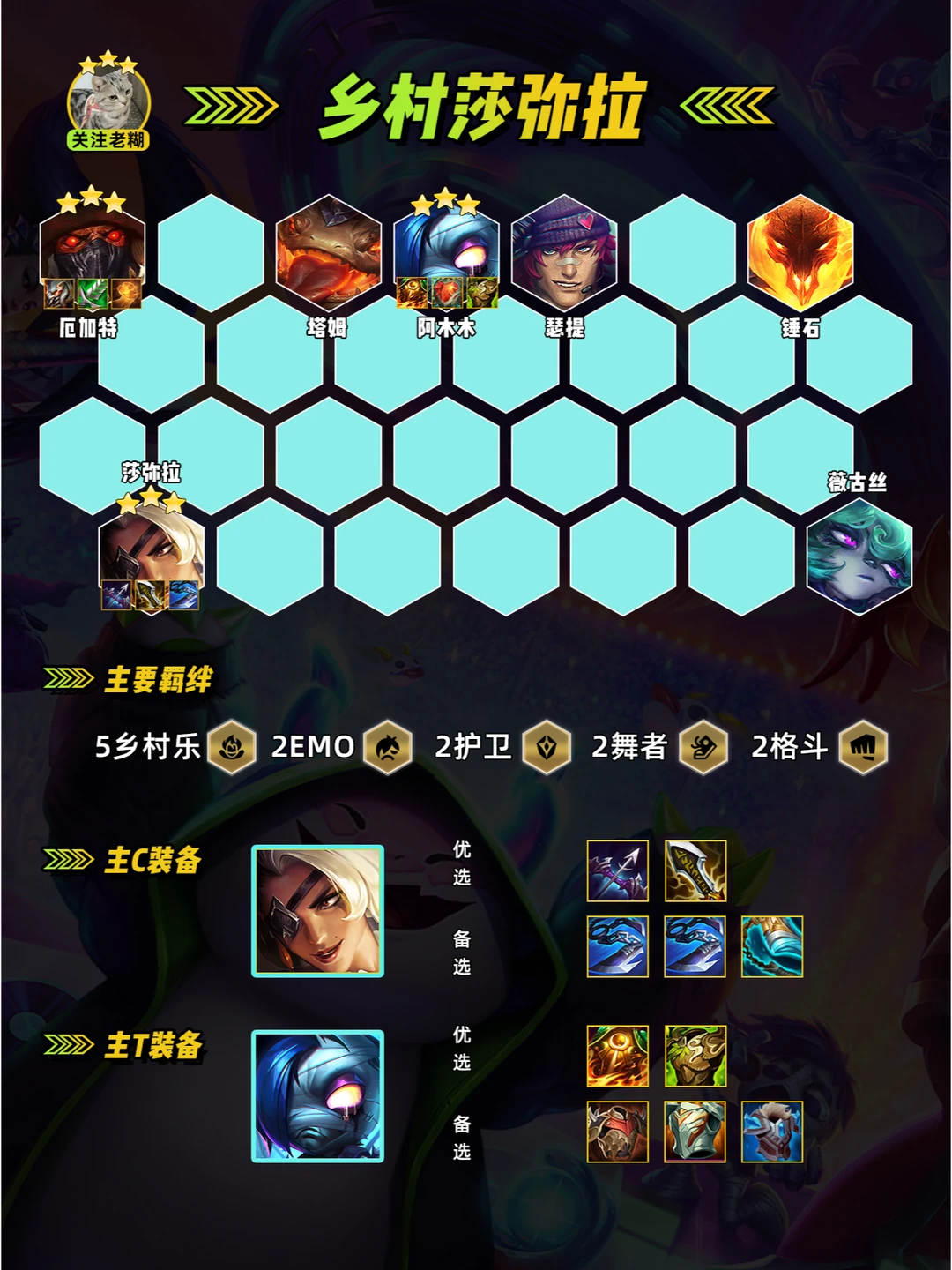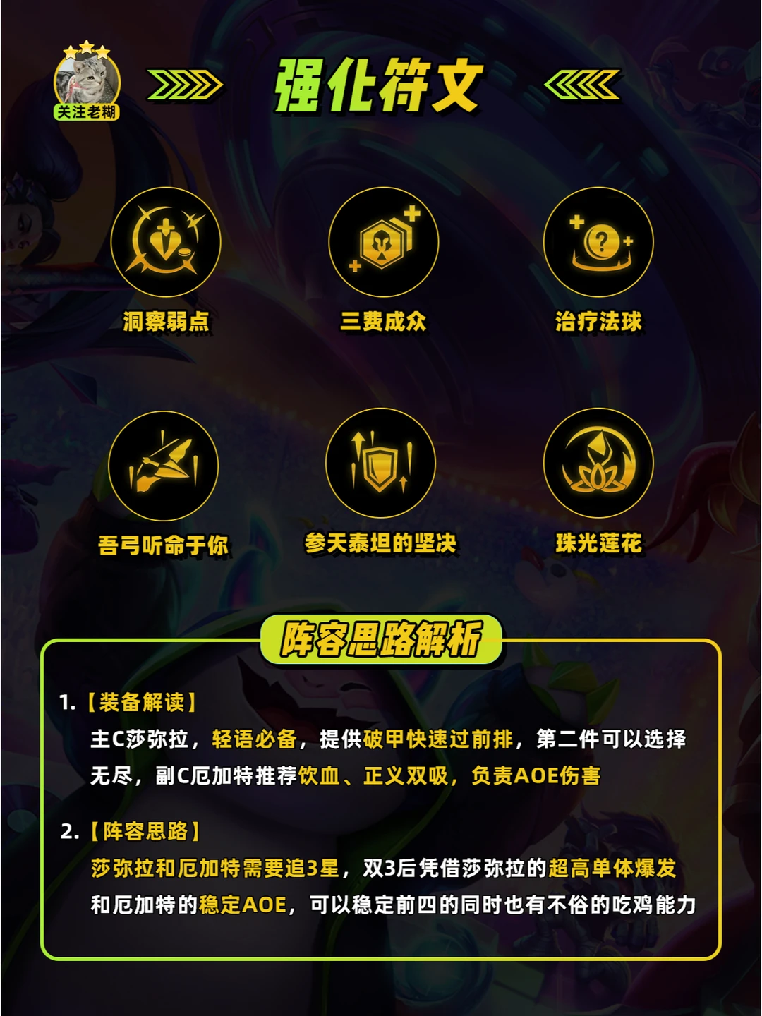 [装备解读] 主C莎弥拉,轻语必备,提供破甲快速过前排, 第二件可以选择无尽,副C厄加特推荐饮血、正义双吸,负 责AOE伤害 [阵容思路] 莎弥拉和厄加特需要追3星, 双3后凭借莎弥拉的超高单体爆发和 厄加特的稳定AOE,可以稳定前四的同时 也有不俗的吃鸡能力