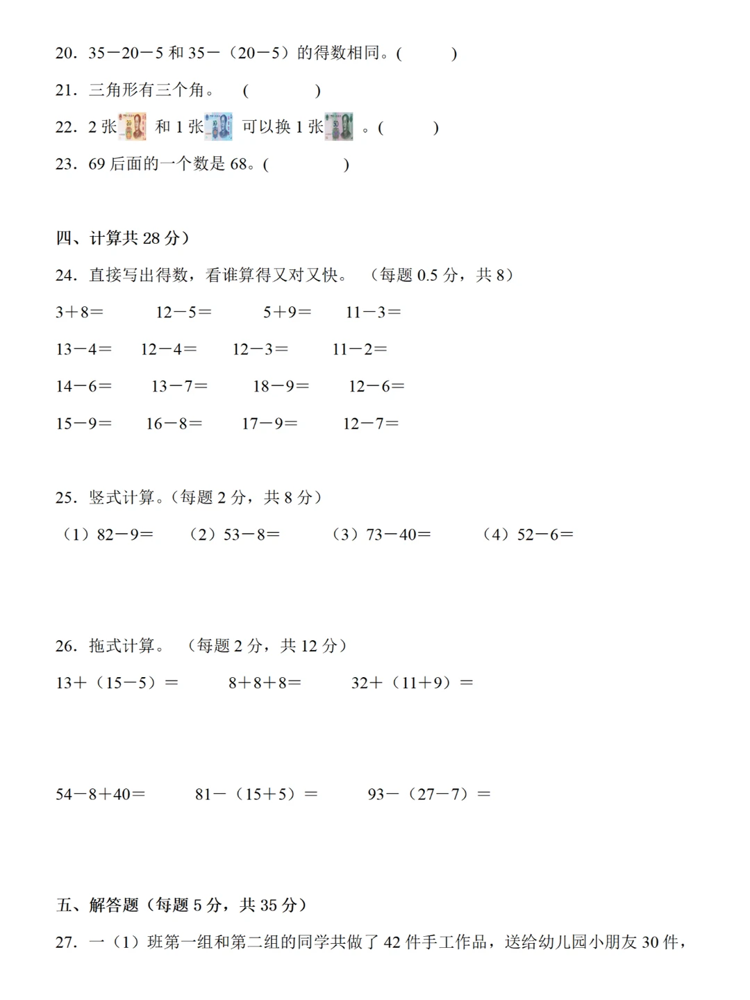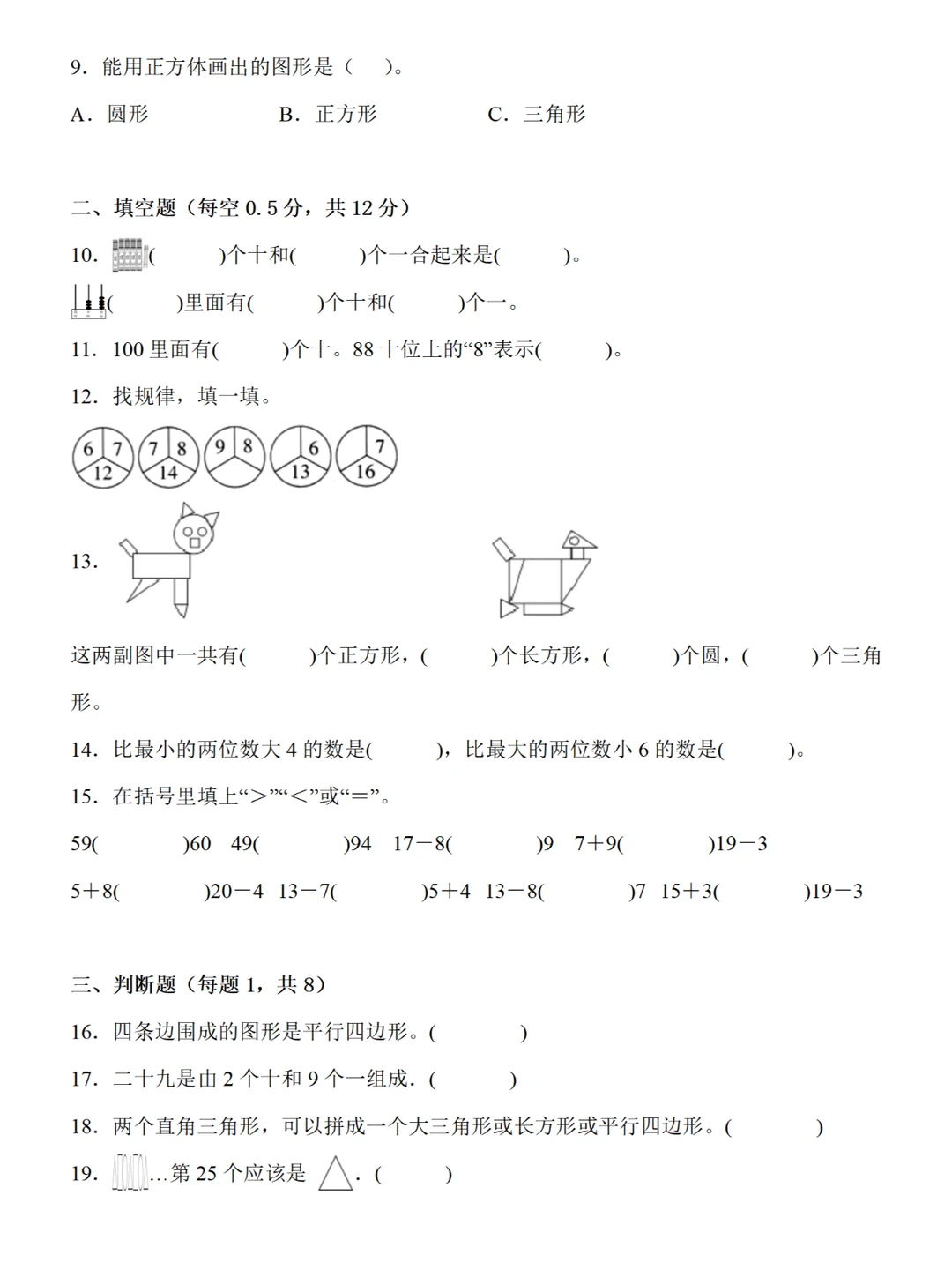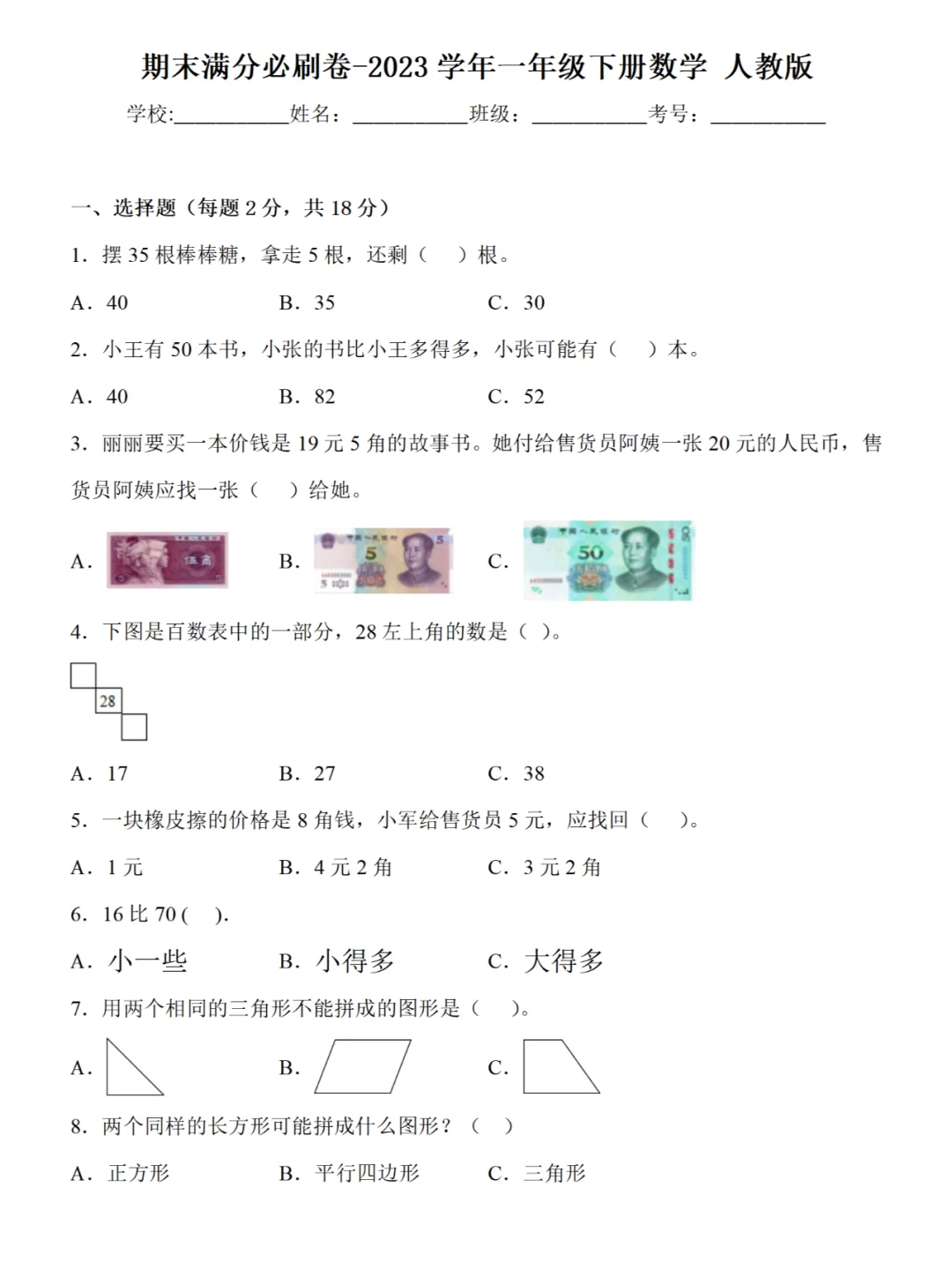 📚人教版小学数学:一年级下册期末考试复习满分必刷卷❗❗ [斜眼R]快来刷题对答案,上了98的孩子,快来扣“666”~