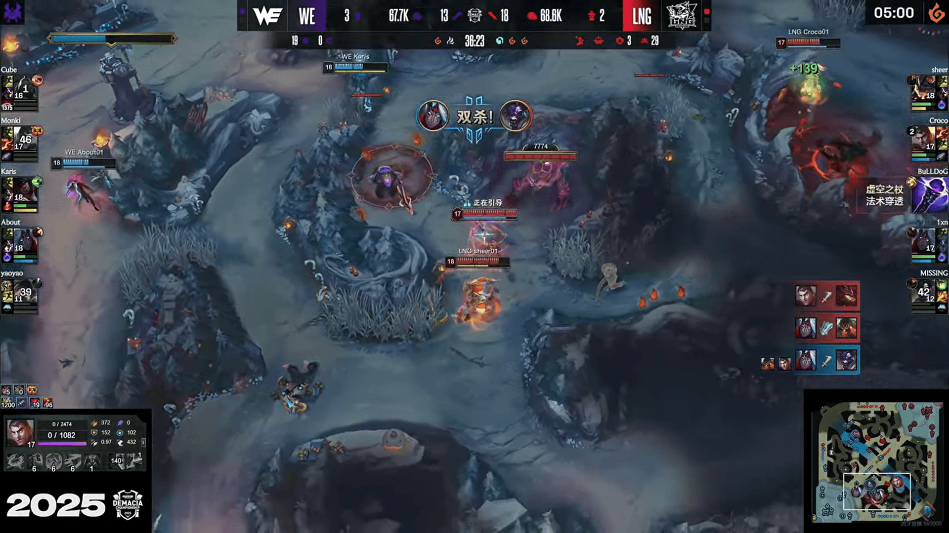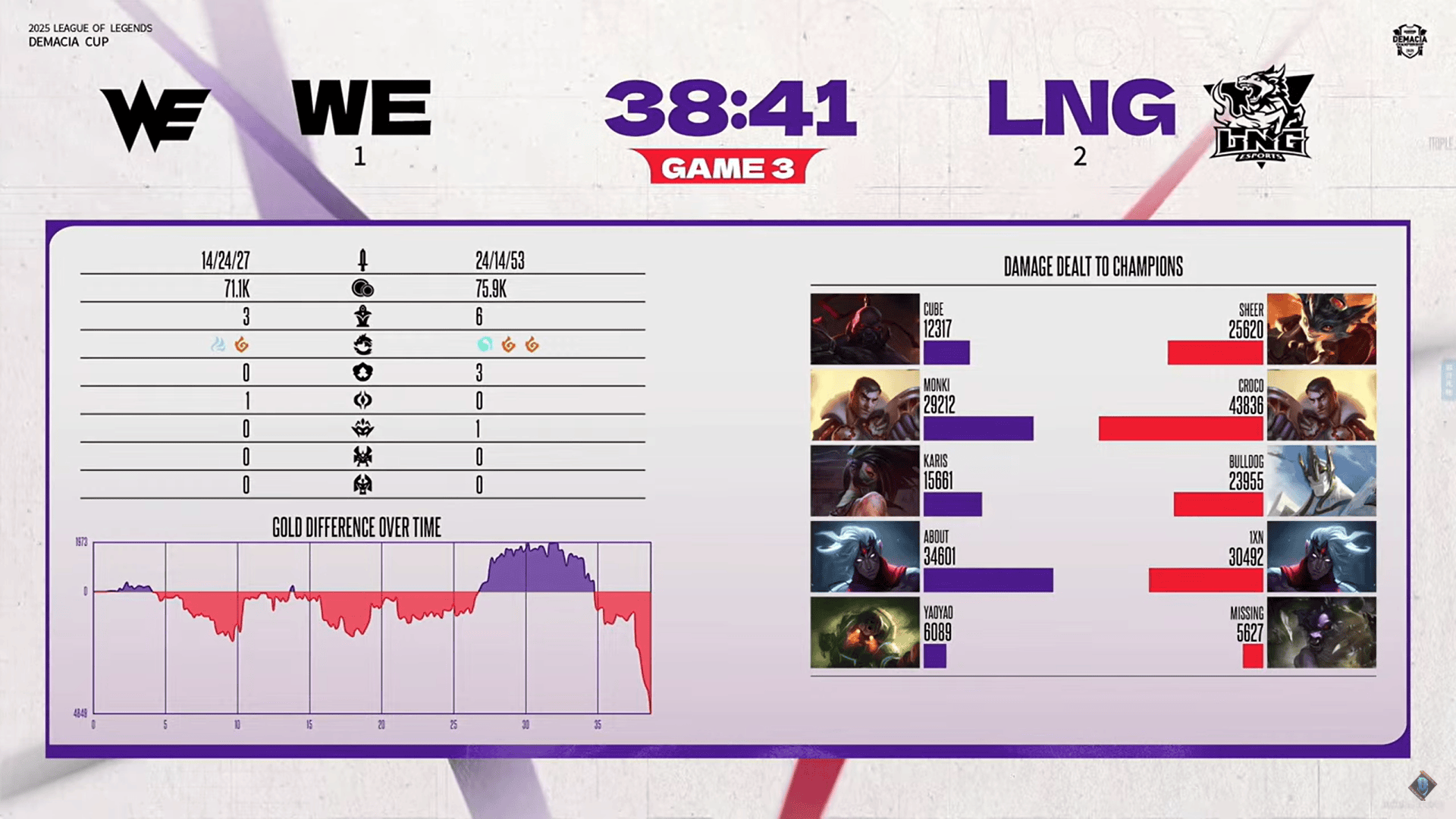 比赛前期两队互有来回,比赛第34分钟,LNG中路一波打出1换3后取得优势。