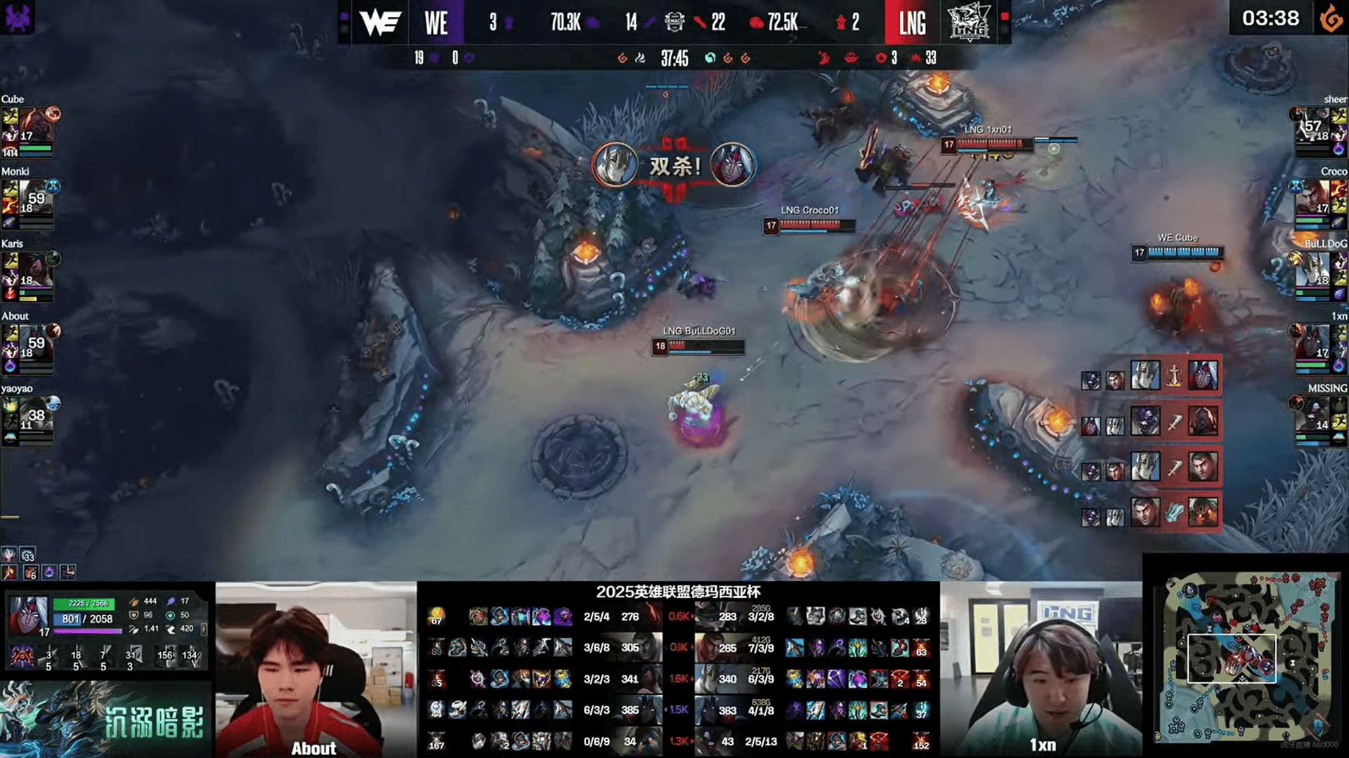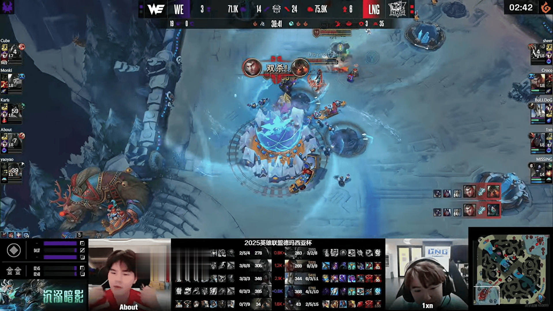 比赛第36分钟,About韦鲁斯双杀打出2换2,但LNG成功拿下听牌火龙。