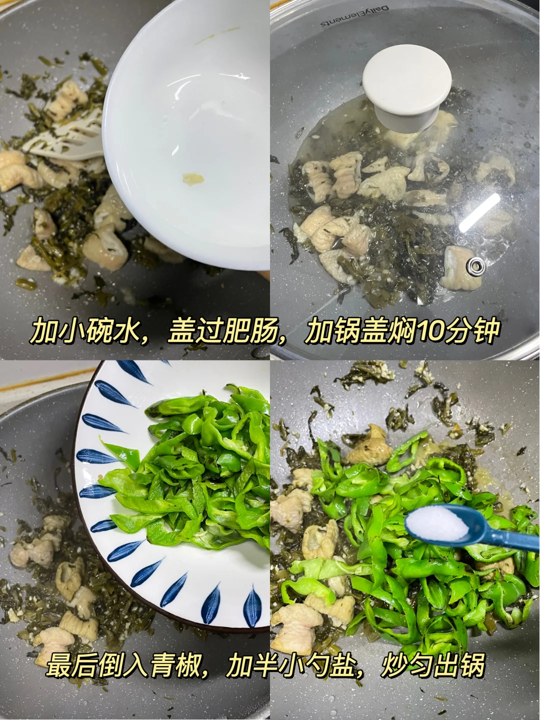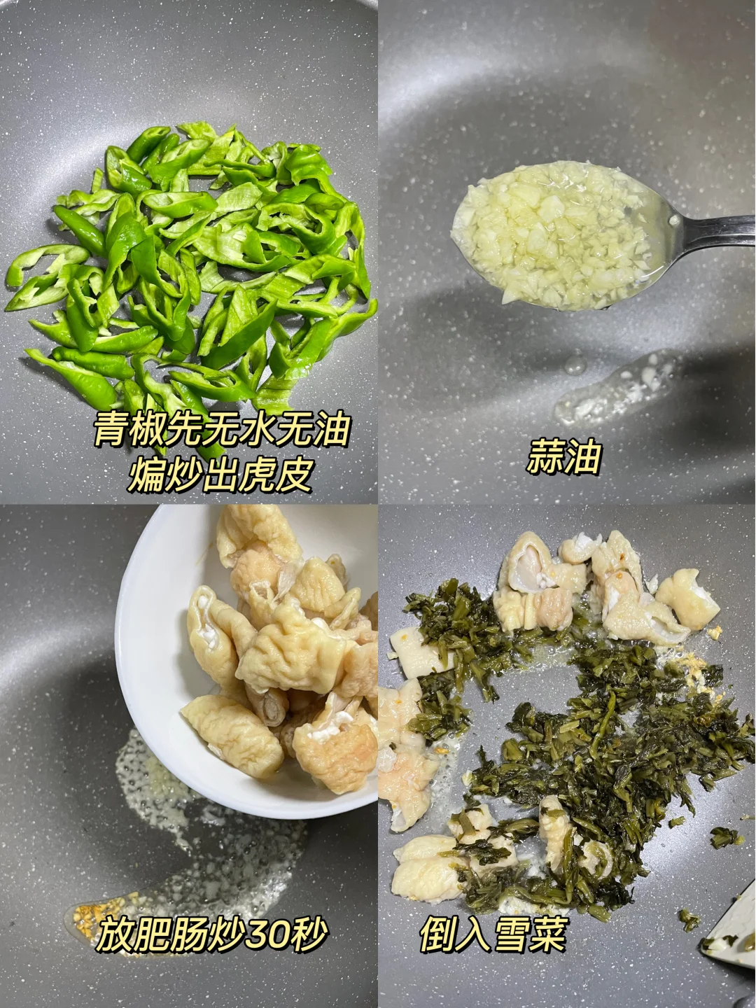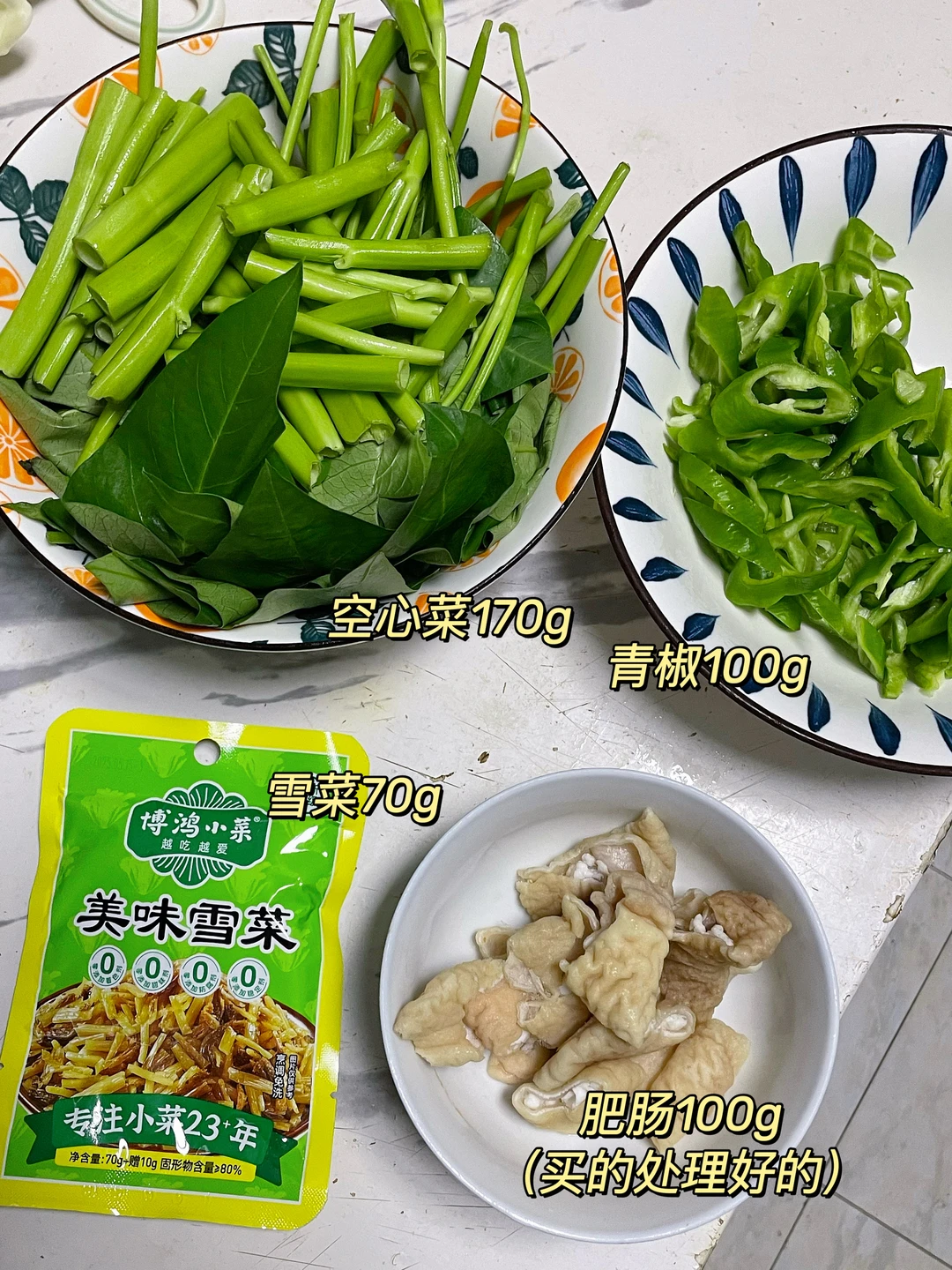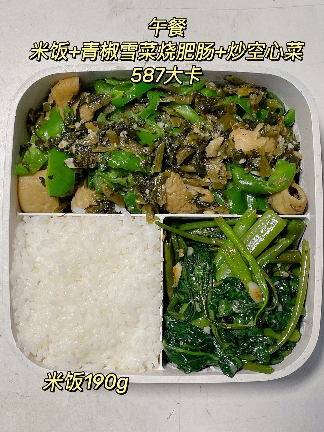 午 米饭+青椒雪菜烧肥肠+炒空心菜