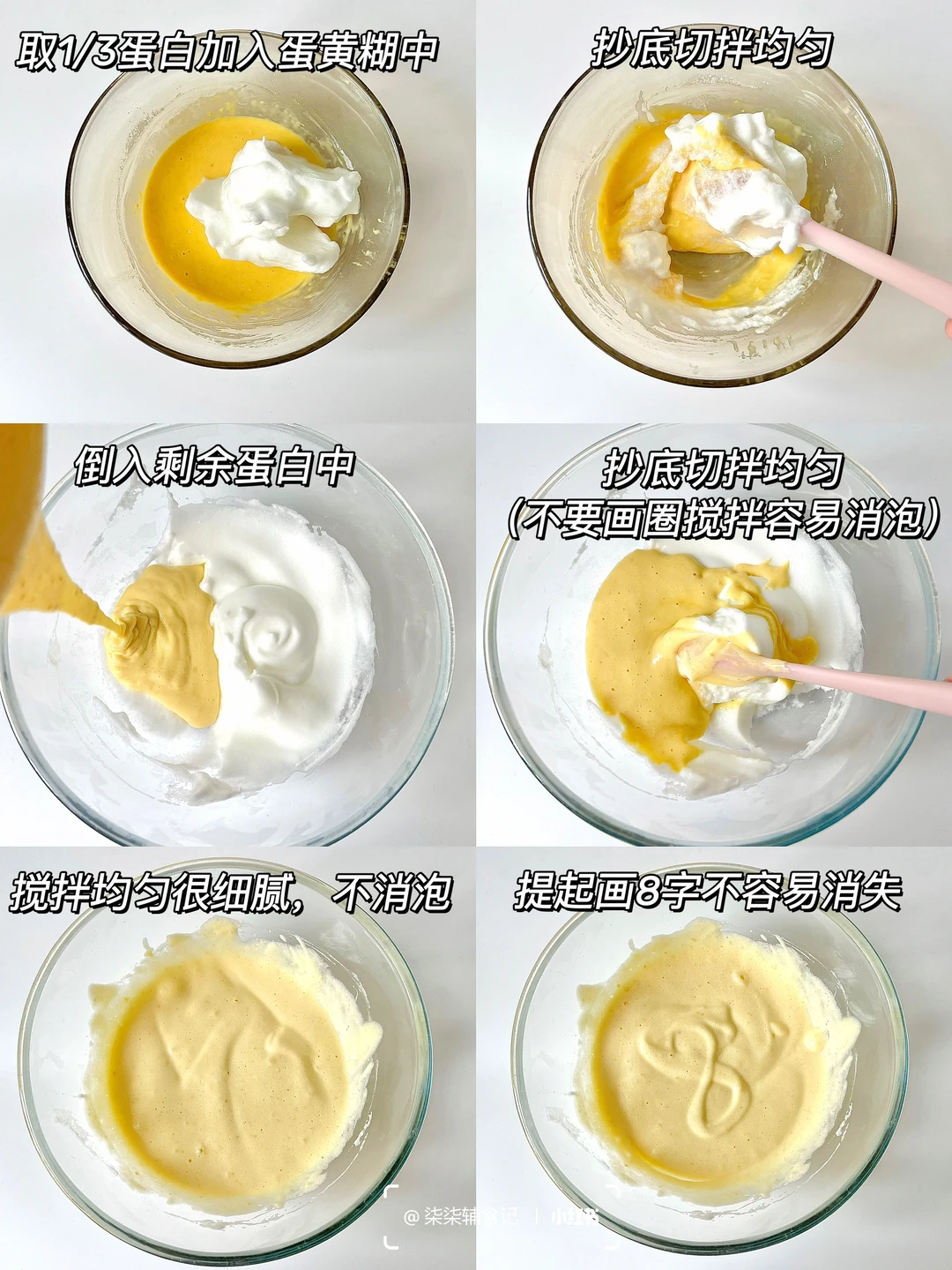 ▫️拌好的蛋黄糊倒入蛋白中,抄底翻起,翻拌均匀,最后呈现的状态提起能画8字,且不易消失