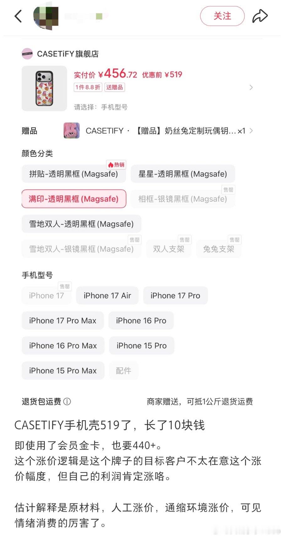 手机壳界爱马仕涨价【手机壳界爱马仕回应涨价:大部分产品涨价10元】近日,单价高达500元、被称为“手机壳爱马仕”的CASETiFY手机壳被曝涨价。有网友发帖称,发现CASETiFY大部分产品全平台上涨10元。12月17日,有CASETiFY线下门店回应称,部分产品价格自12月16日起有所上调,包括苹果、三星手机全部配件、卡包支架、吸盘支架等,大部分产品涨价10元。原价799元的水钻手机壳目前售价809元,为今年首次调价。另部分产品如华为手机配件、指环支架和气囊支架等未涨价。CASETiFY客服则回应称,价格调整是由多种因素综合决定的。(IT之家)