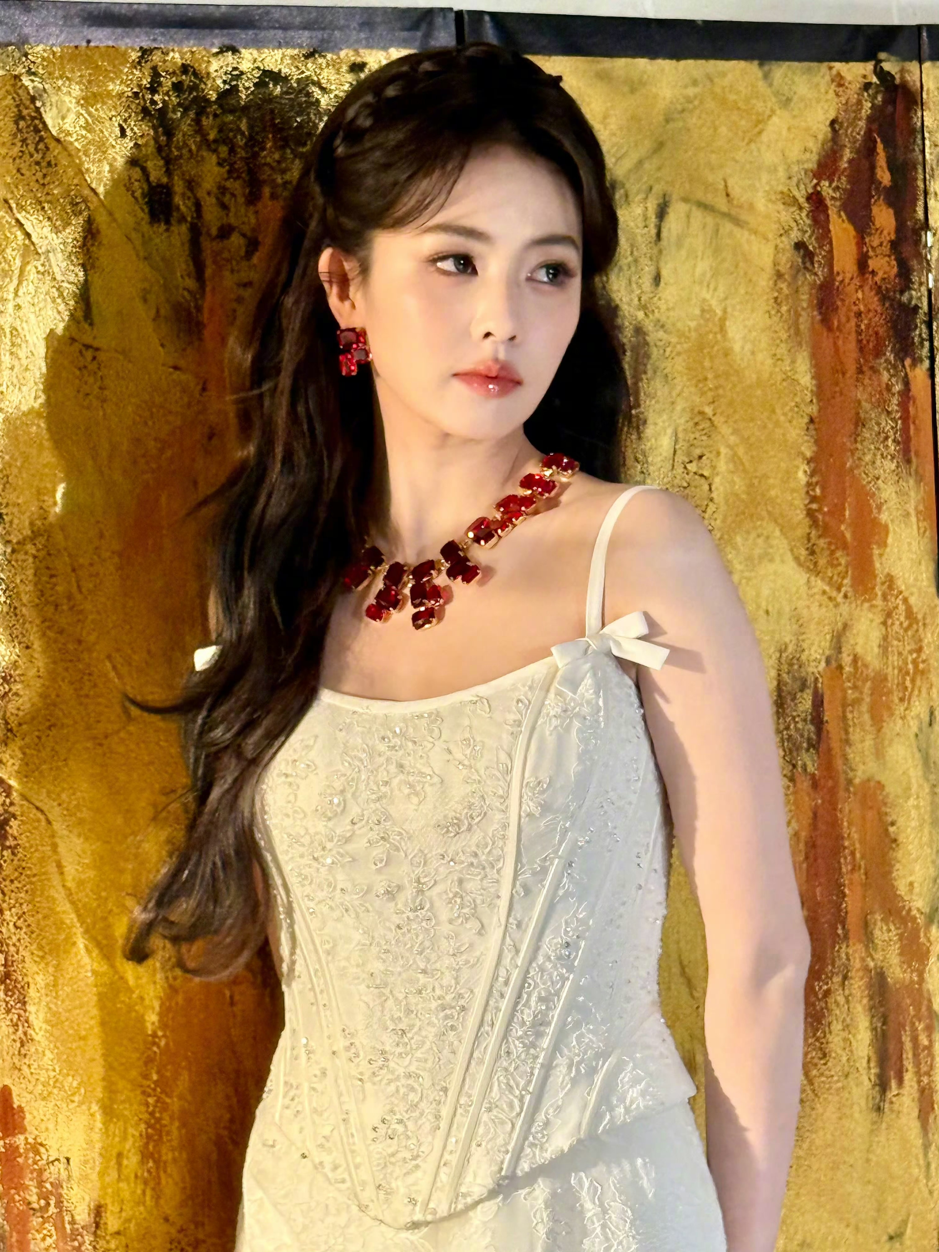 白鹿 今日品牌活动造型图,身穿Reem Acra 2026春夏婚纱系列礼服,钻饰蕾丝裙、红宝石珠宝… 再搭一双Jimmy Choo花朵高跟鞋,明媚优雅的公主气质,尽显温婉动人身姿。👠🌺🪭