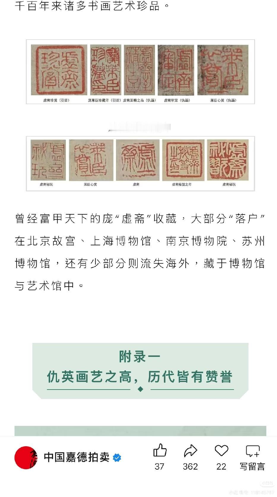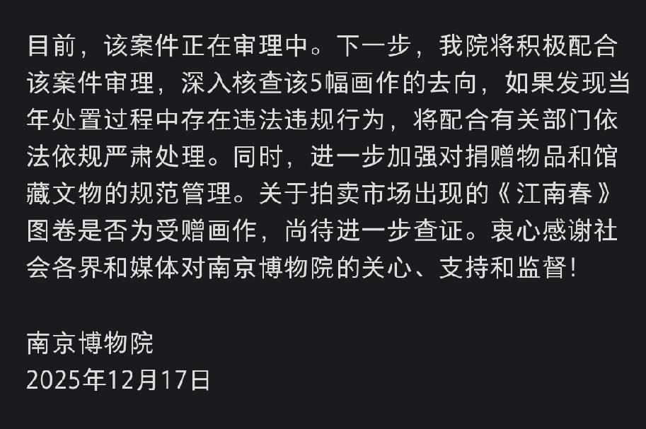 南博这次是有点说不清了,嘉德今年5月份公众号里发的文章不就说的是拍得是捐赠那幅吗?连捐赠人的收藏印都有。 刚刷到南博的回应,称对于庞先生捐赠的画作在1961年找专家组鉴定,《江南春》及其他四幅为“伪”,到1964年又一次找专家组,鉴定为“假”。 他们将一查5幅画的具体下落,二要查拍卖这幅跟捐赠这幅是不是同一幅。 可不管真伪都不是拍卖换钱的理由啊!是真品就好好保管好好展出,是赝品就还给人家,也不能变成私财。 更何况庞元济是我国书画收藏大家,他加盖上自己印章的作品再被说成假的,怎么也得有相当靠得住的说法和依据吧! 还有南博提到在90年代依据《博物馆藏品管理办法》处理了这批“伪作”,可翻遍管理办法也只说即便不是正式藏品,也需要建档建卡片,注明信息,如出库需要很多道手续,并未见走“拍卖”这种。