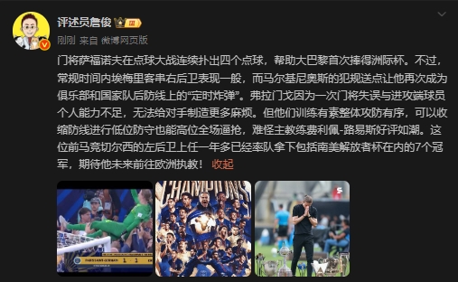 “门将萨福诺夫在点球大战连续扑出四个点球,帮助大巴黎首次捧得洲际杯。不过,常规时间内埃梅里客串右后卫表现一般,而马尔基尼奥斯的犯规送点让他再次成为俱乐部和国家队后防线上的“定时炸弹”。