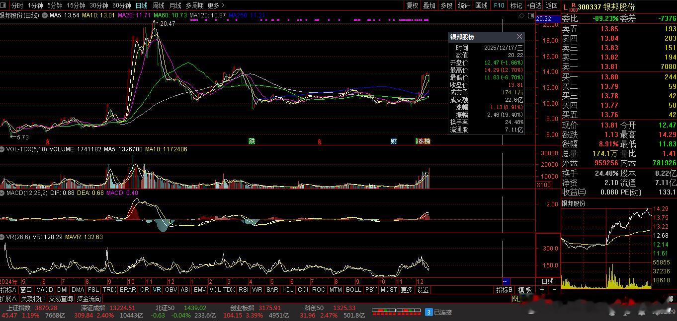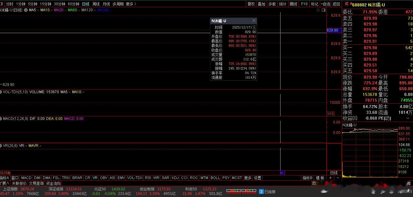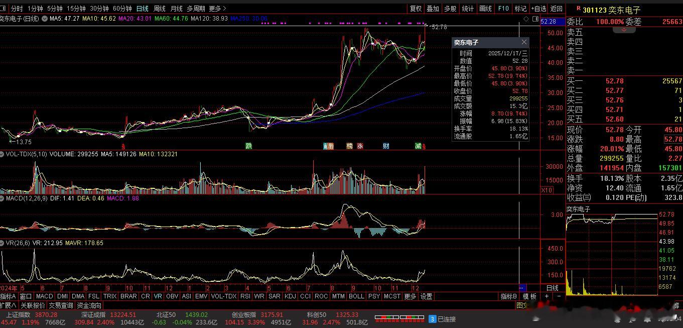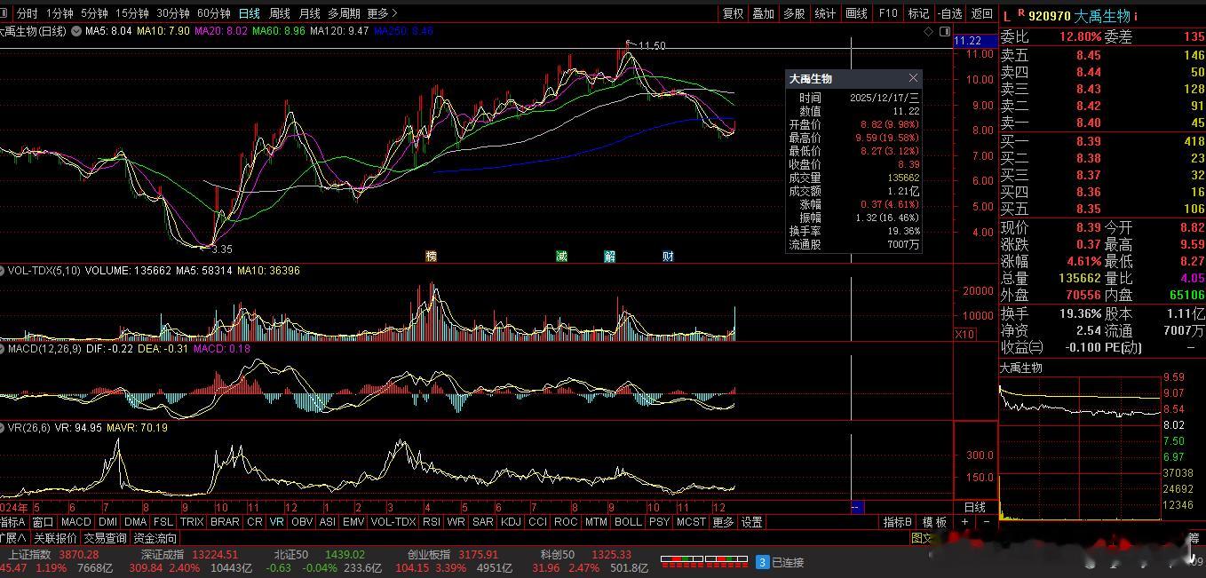 【财富晚茶】午盘透析(12.17):北证跌幅0.83%:游戏反弹林业回调导语:作者系《网易号》优质财经领域创作者。曾经原创作者和知名网易号旅游领域创作者。大跨度行业等的写作,颇受网友喜爱。作品发表于2025.12.17.12:18 优雅端庄晚风。(标题作品:全球最佳游戏:《艾尔登法环》DLC:魂系游戏巅峰续作,扩展地图与剧情,保持高难度与碎片化叙事特色)【内容概述】今日股市午评:截止11:30:沪指:贡献2根阳线1阴线。深指:贡献1根阳线2阴线。沪指突破:阻力位:03862点。沪指突破:支撑位:03815点。深指突破:阻力位:13113点。深指突破:支撑位:12851点。追寻盘面:沪深强势安营扎寨,尾盘见顶高位震荡。一、透析市场:风口公司,上下起伏920970 大禹生物 盘中01涨1、突破四年箱底视野盘面:前期双低:超跌盘升。2025-12-17 截至11:30 股价报收:8.39元。该股上涨:4.61%。成交总量:135662手,成交金额:1.21亿元。总换手率9.36%,观总市值:9.30亿元。流通市值:5.88亿元。2、饲料添剂翘楚主营业务:饲料添加剂-饲料兽药的产和销售。公司品牌:微生态制剂技术渠道优势企业。3、营收优利减亏财报透视:2025-09-30 三季度报:公司营收:9245.317万 同比增3.59%。公司净利:-1071.6271万 同比增33.51%。二、沪深红盘:多方强势,喜剧股市今天目击:沪深北市:早盘:沪指:低开一涨,二跌二涨。深指:高开二涨,二跌二涨。尾盘:一跌一涨,次高红盘。看点之一:沪指弱势:盘中低开。窄幅震荡:瞬间上扬。看点之二:创指强势:快速拉升,涨幅超1%。看点之三:沪深北市:半日成交:10403亿元。盘面追踪:3727股飘绿。三、沪深阳棒:个股强势,赚钱效应沪深追踪:截至午间:市场收盘:沪指涨0.17%报3831.43点,深指涨0.83%,创指涨1.21%,北证50指跌0.83%,沪深北市:10403亿元。四、盘面观察:游戏脉冲,林业回调1、板块扫描透析沪深板块:板块走强:半导体等。板块走低:酿酒、农业、汽车、地产等。板块拉升:旅游餐饮、保险、有色、食品饮料等。概念活跃:锂矿、CPO概念、液冷服务器等。2、个股涨跌起伏沪深北市:多空遭遇。1091上涨,58个股涨停板。4300股下跌,27跌停板。沪深北市:合计成交:10403亿元。午盘视野:沪弱深强强势反弹,尾盘高位窄幅震荡。五、沪深涨跌:三甲前茅,安不忘危1、今日涨幅谁家主旋律:天经地义:风口股票涨停板688802 N沐曦 301123 奕东电子 300337 银邦股份第一、涨幅榜眼排行榜-1:68688802 N沐曦主营业务:人工智能训练和推理-通用计算与图形渲染领域全栈GPU产品研产和销售。公司品牌:国内高性能GPU产品领军企业。排行榜-2:301123 奕东电子主营业务:FPC、连接器及零组件、LED背光模组等精密电子零组件的研产和销售。公司品牌:CCS工艺行业领先。排行榜-3:300337 银邦股份主营业务:铝合金复合材料-铝基多金属复合材料-铝合金非复合材料的研产和销售。公司品牌:铝钢复合材料全球最优秀头部企业。第二、综评榜技术看盘-1:301123 奕东电子。潜力股票-1:301123 奕东电子:CCS工艺行业领先。风险股票-1:暂时没有。2、今日跌幅谁家主旋律:摇摇欲坠:弱势股票涨停板920765 美之高 920665 科强股份 688790 C昂瑞跌幅榜-1:920765 美之高主营业务:金属置物架收纳用品的研产和销售。公司品牌:中国领军空间收纳定制化解决方案服务商。跌幅榜-2:920665 科强股份主营业务:高性能特种橡胶制品的研产和销售。公司品牌:列车风挡棚布等细分行业头部企业。跌幅榜-3:688790 C昂瑞主营业务:射频前端芯片-射频SoC芯片-其他模拟芯片的研产和销售。公司品牌:国内头部射频前端头部企业。六、创作不易:优质网易,财经作者投资投机迷茫之中:给予尽可能有帮助:资本市场风险自负。(优雅端庄晚风《网易号》财经领域创作者和原创作者 违者必究)