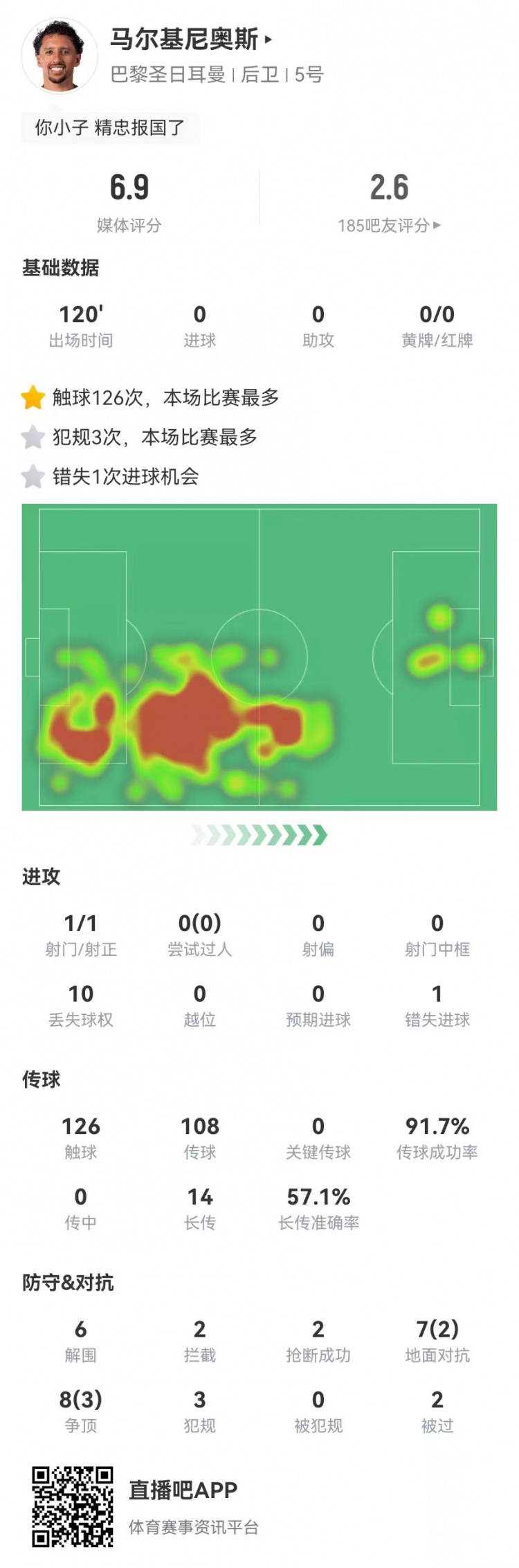 直播吧12月18日讯巴黎在洲际杯决赛点球击败弗拉门戈,队长马尔基尼奥斯面对祖国球队的表现如下: