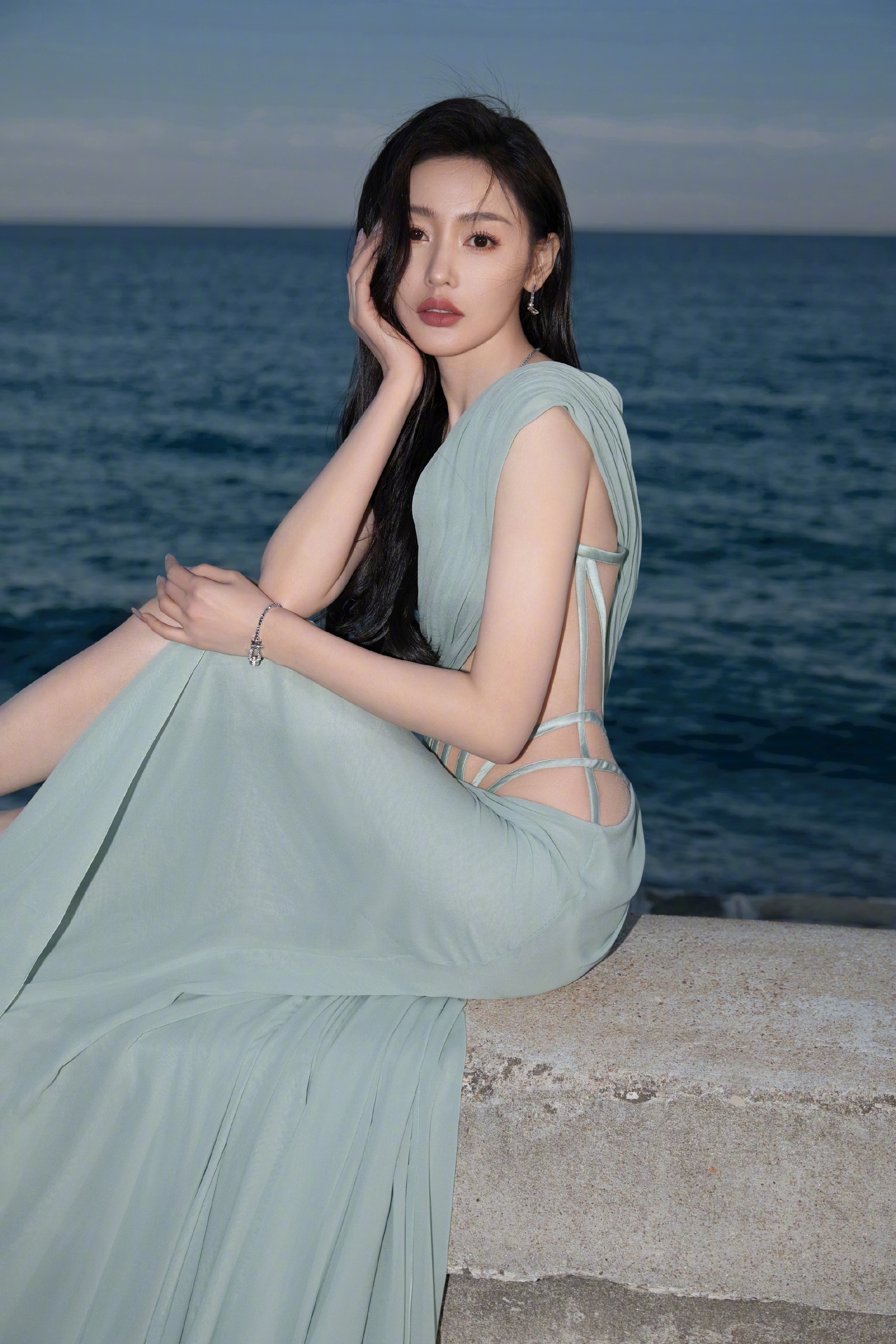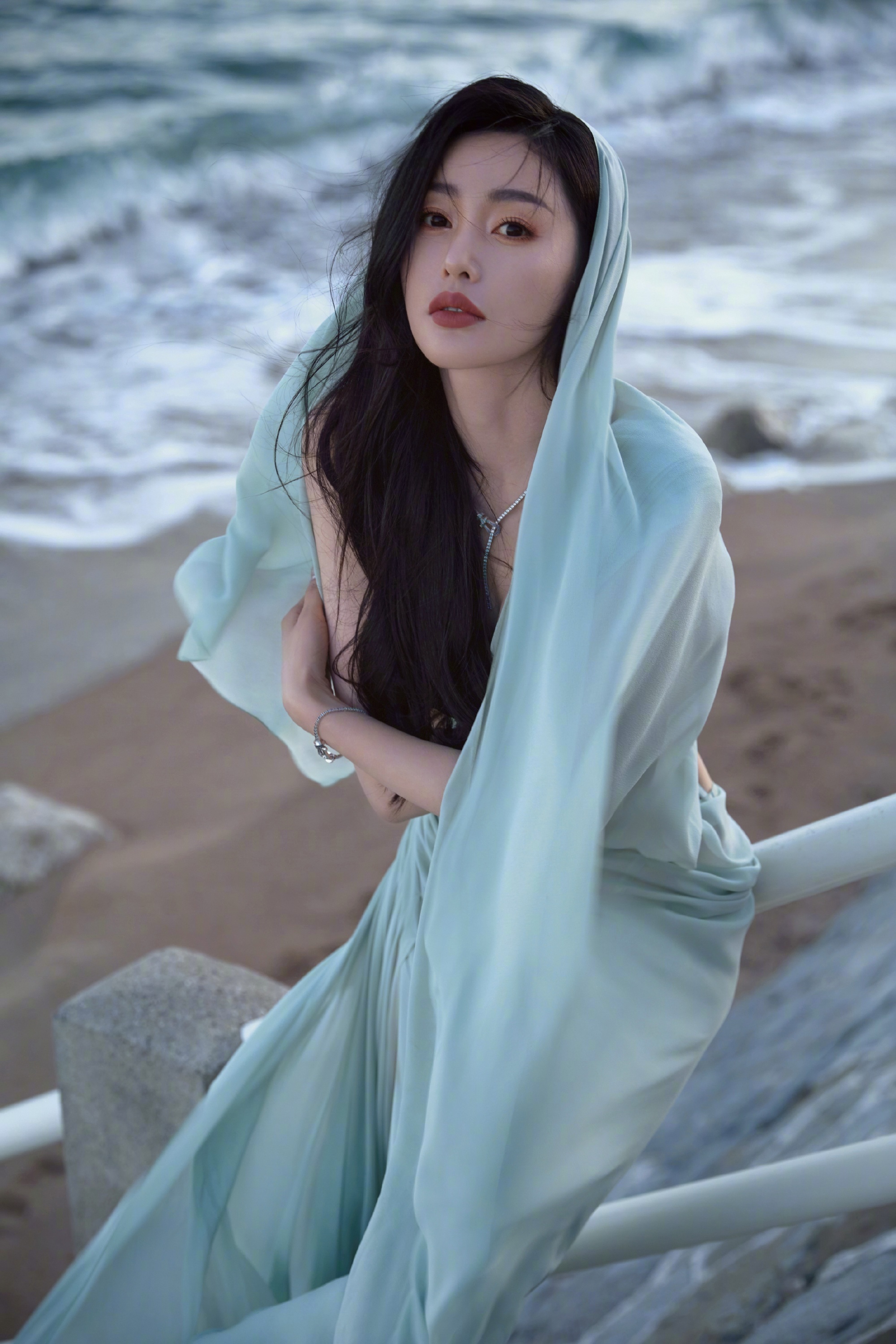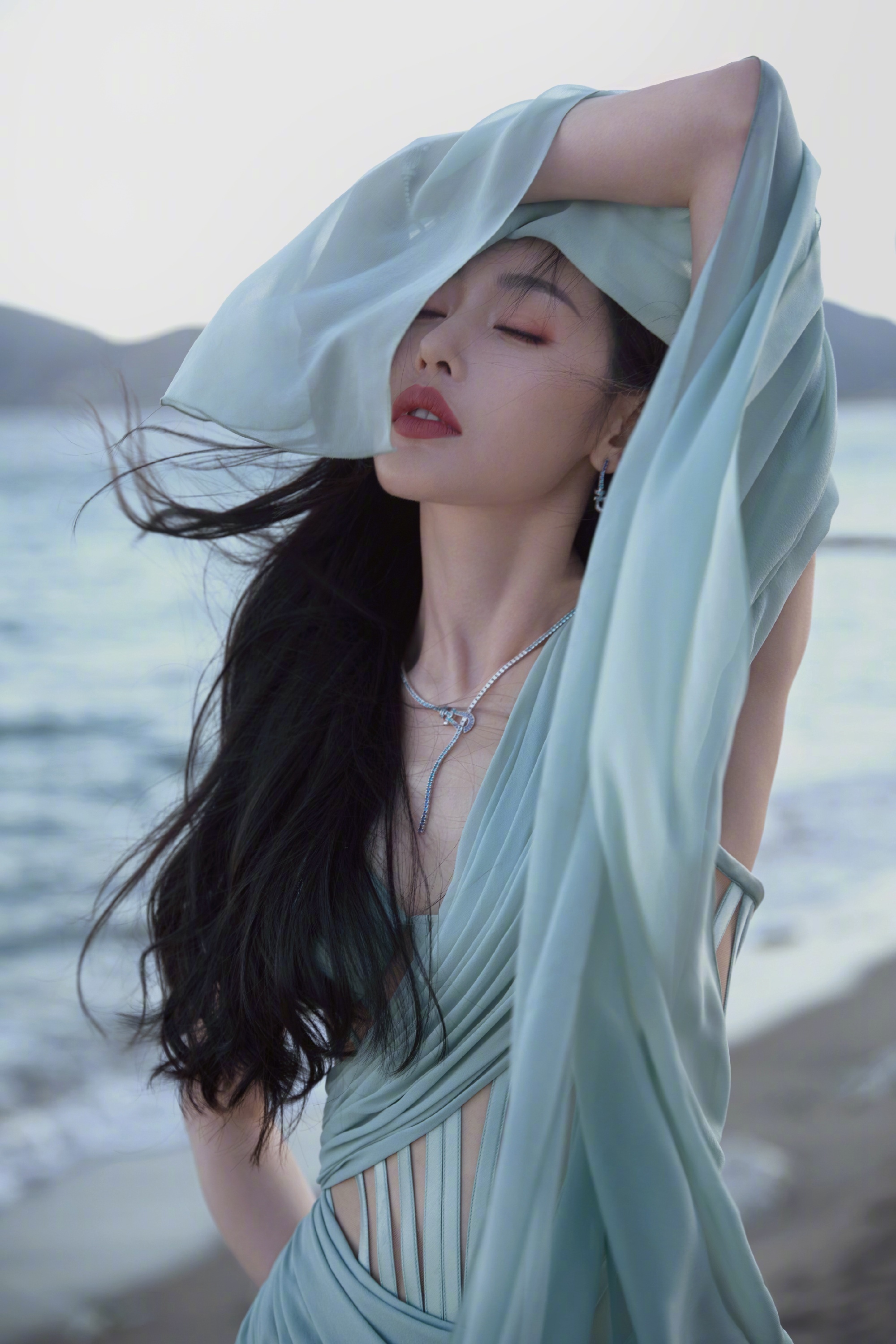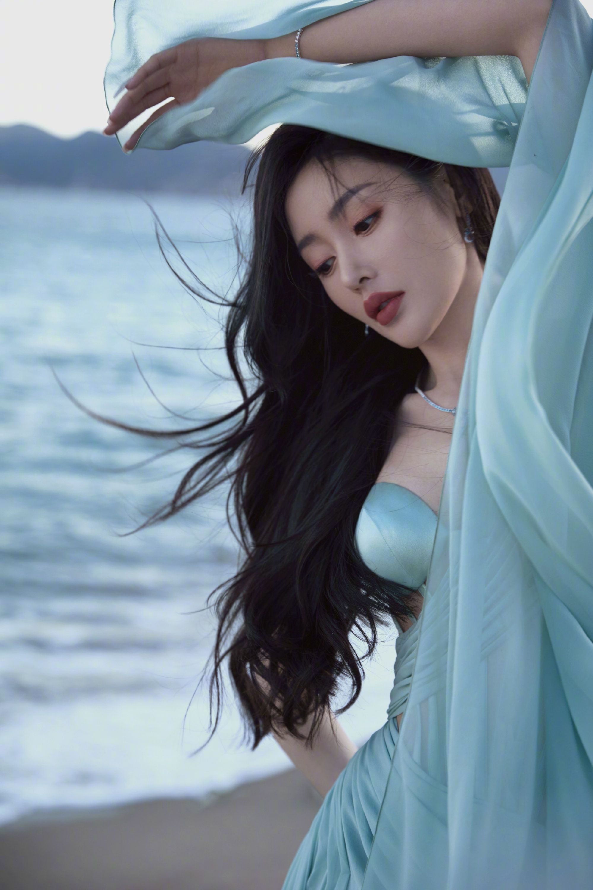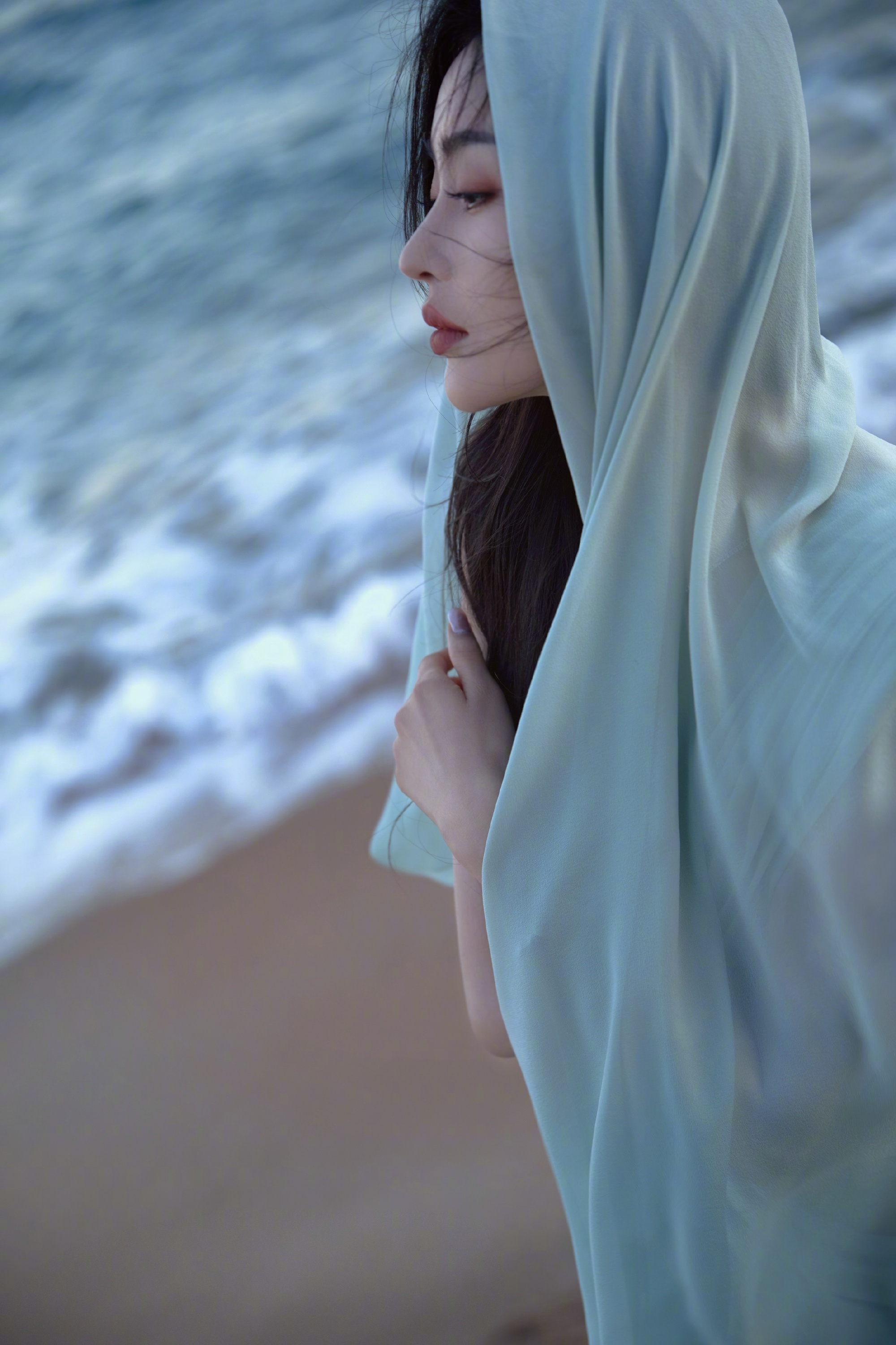 张天爱海滩大片,淡蓝色彩轻纱曼舞,柔美活力姿态。张天爱
