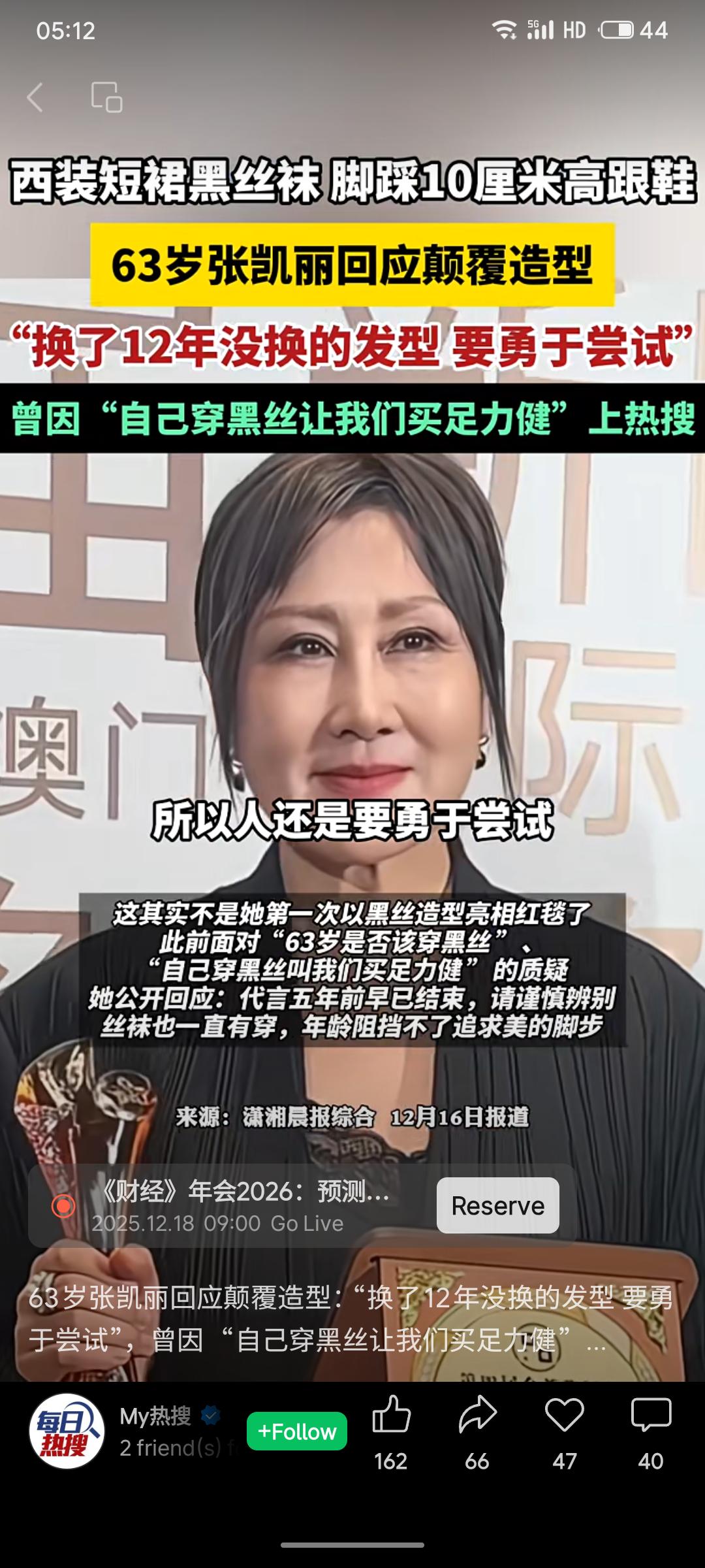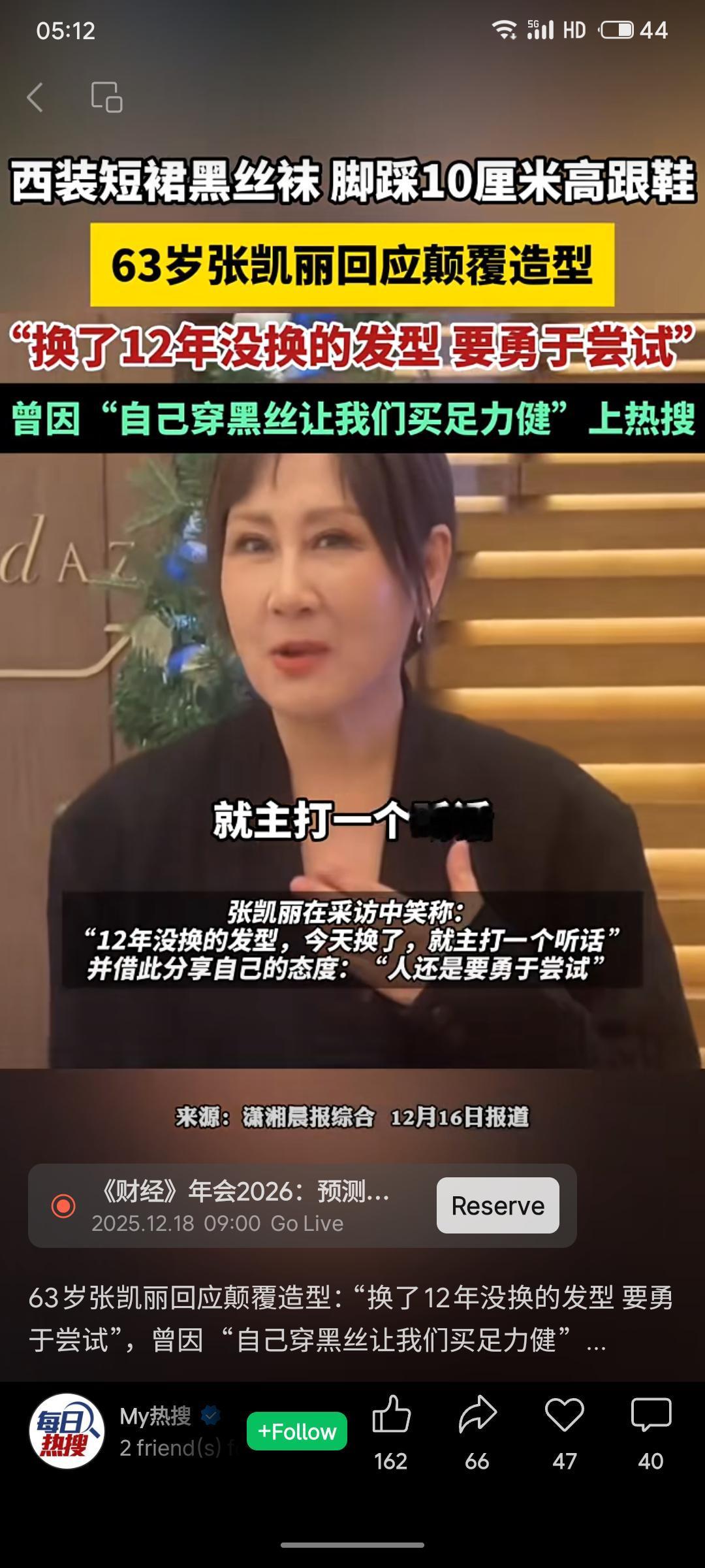 63岁演员张凯丽近日以西装短裙、黑丝袜配高跟鞋的造型亮相红毯,并回应称“换了12年发型,要勇于尝试”。此前她曾因“穿黑丝推荐足力健”引发讨论,其表示代言早已结束,年龄不应限制对美的追求。