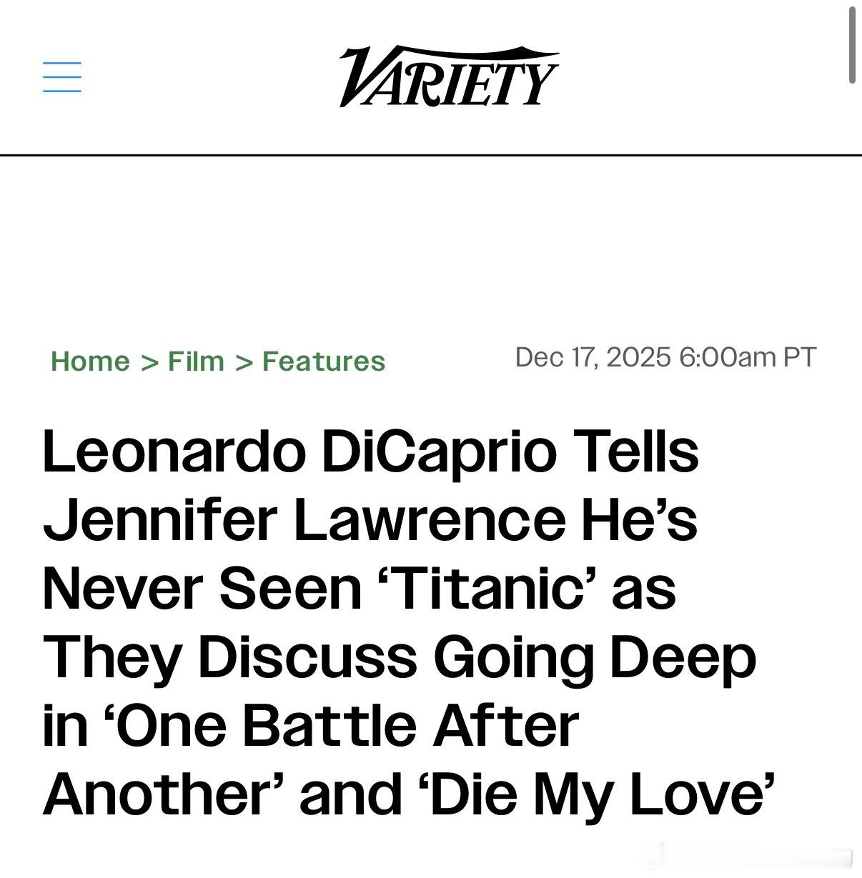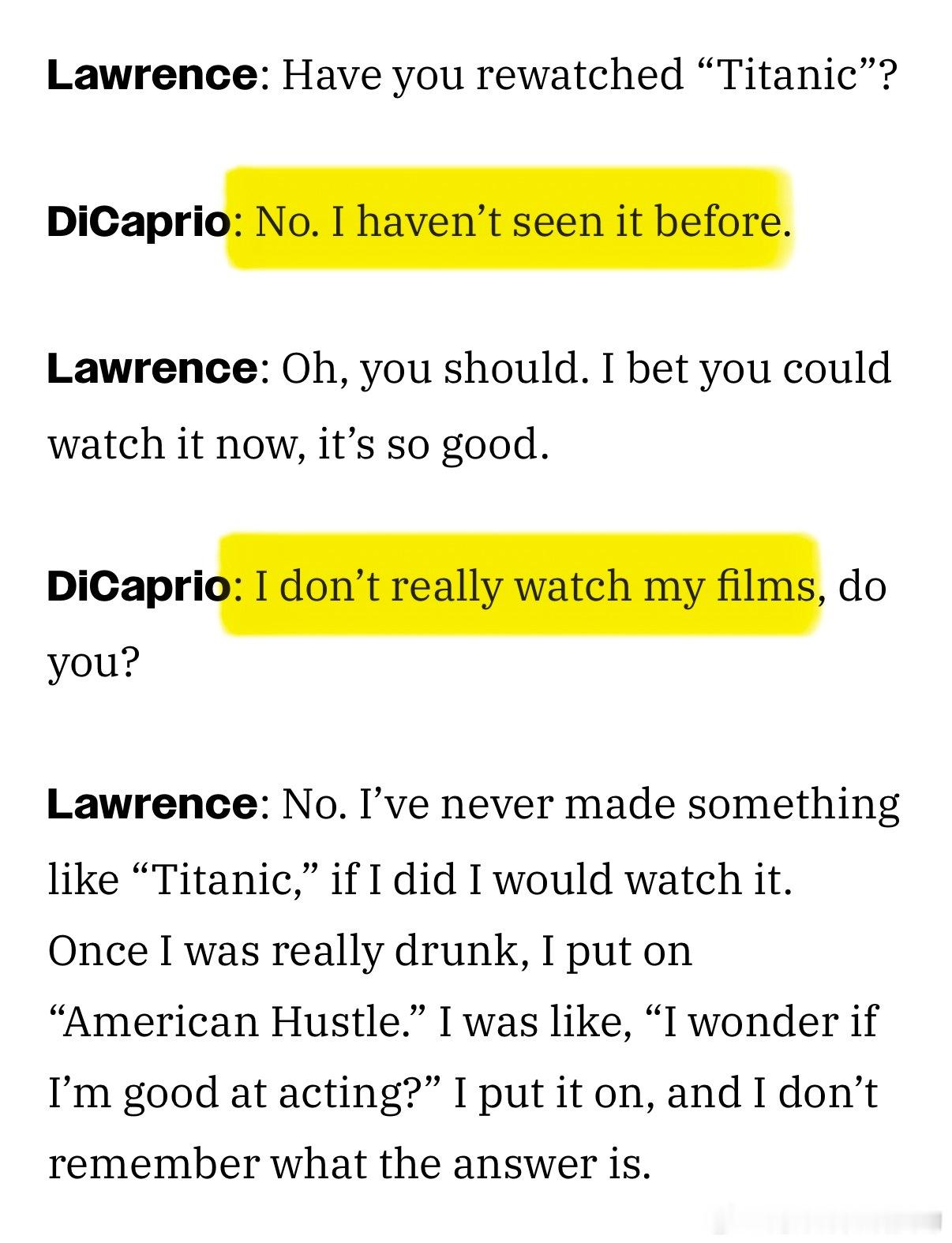 小李子竟然没有看过《泰坦尼克号》 “小李子”莱昂纳多·迪卡普里奥和大表姐“詹妮弗·劳伦斯”对谈了他俩的新片《一战再战》和《去死吧,我的爱》大表姐问小李子,“有没有重新再看《泰坦尼克号》?”小李子,“不,我从来都没看过”“我从来都不看我自己演的电影”跨年电影愿
