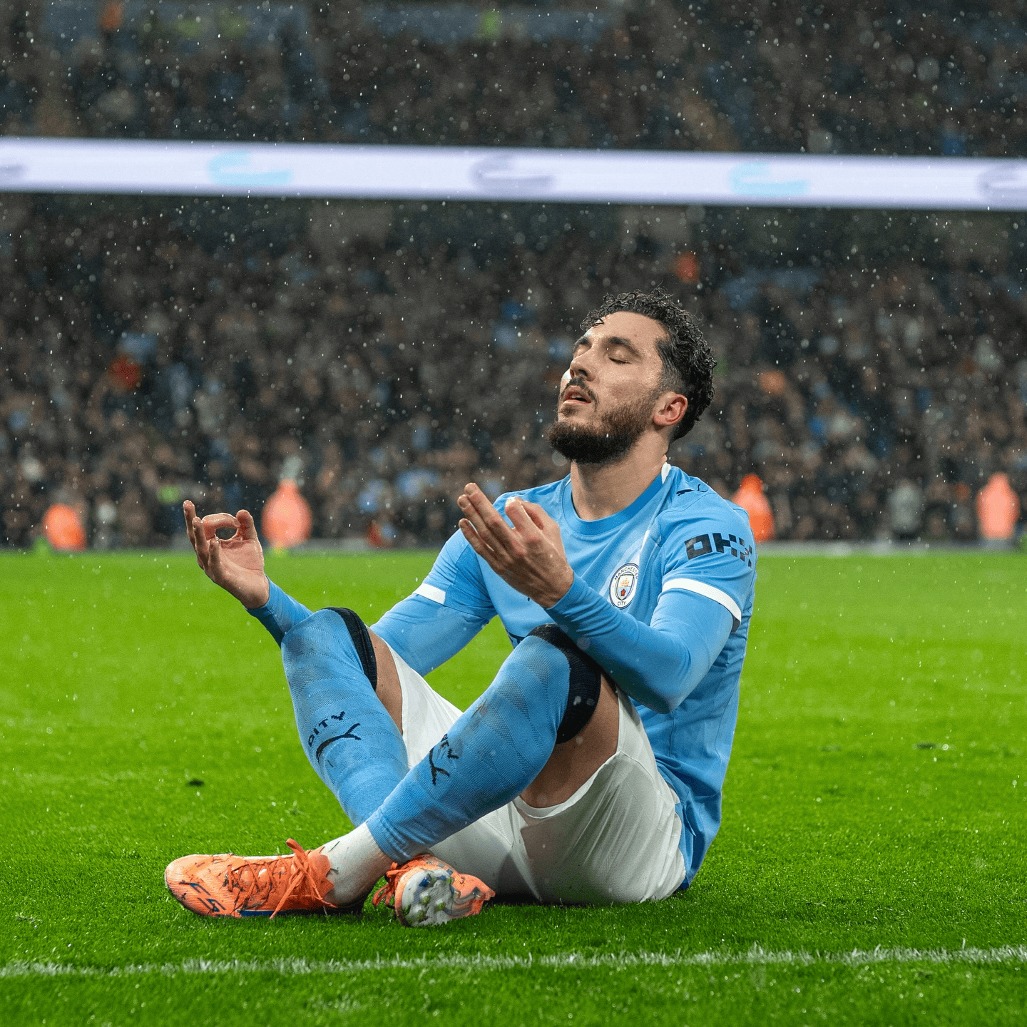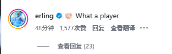 进球后,他也模仿哈兰德做出了打坐的庆祝动作。