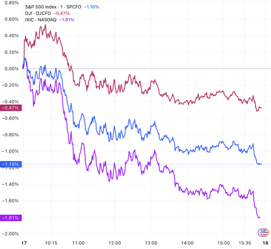 截至收盘,道琼斯指数跌0.47%,报47,885.97点;标普500指数跌1.16%,报6,721.43点;纳斯达克指数跌1.81%,报22,693.32点。